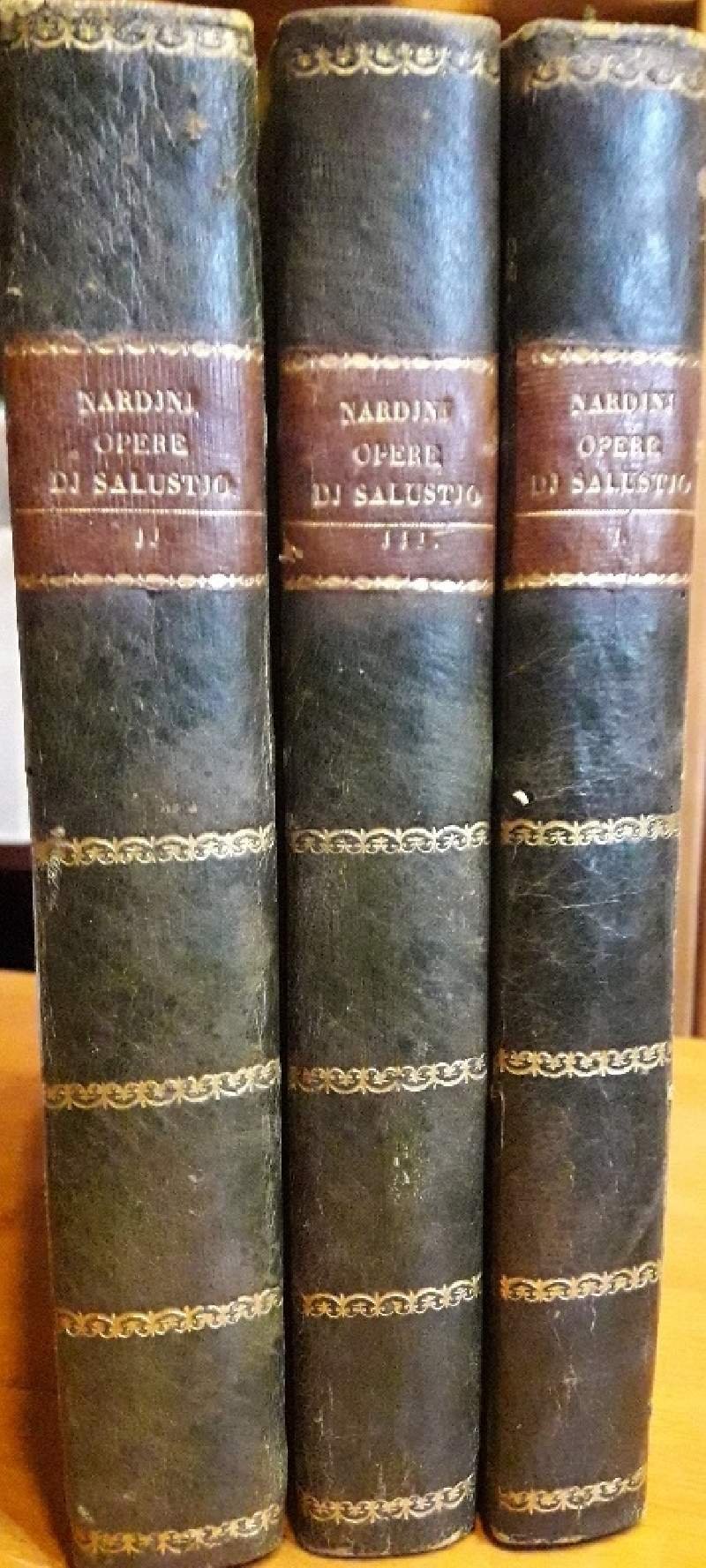 Tre volumi in 8'. Legat. in m. marocchino coevo, pp 246, 340, 236. Bell'esemplare con i tagli marmorizzati.Timbro appartenenza ai frontespizi, strappo alla prima bianca del I vol. Opere di C.C. Salustio in italiano recate dall'Abate Bartolommeo Nardini membro del magistrato di revisione col testo a fronte e con note. Luogo di pubblicazione BresciaEditore Nicolo' BettoniAnno pubblicazione 1806Materia/Argomento Letteratura Latina ***Due to bureaucratic reasons, books dated over 70 years old cannot be immediately exported, please contact us before placing the order.***
