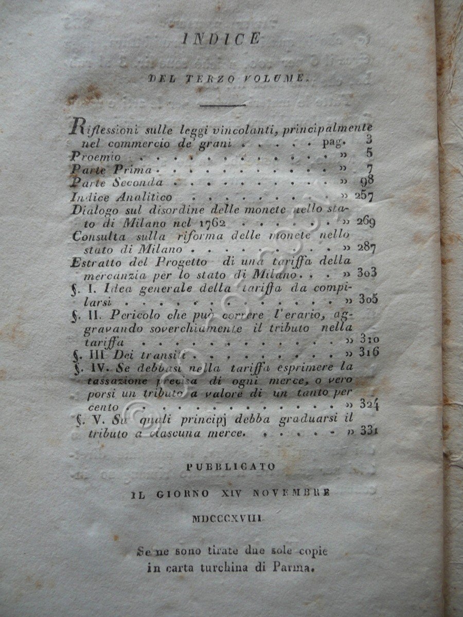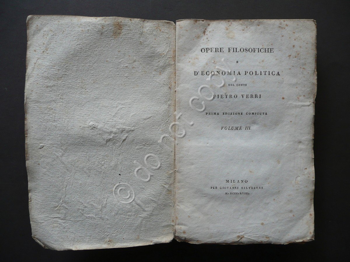 Pietro Verri, Opere filosofiche e d'Economia politica del Conte Pietro Verri prima edizione compiuta volume III Per Giovanni Silvestri, Milano 1818, cm 16,5x10,5, pp. 335, brossura ed. Condizioni di conservazione Esemplare in discrete condizioni, brossure con alcune irregolarità, poche piccole pieghette e minimi strappetti, dorso fessurato con alcuni strappetti e piccole mancanze, con conseguente distacco quasi totale di qualcuno degli ultimi fascicoli. Interni buoni, intonsi, con alcune lievi bruniture. Solo volume III. Tra i testi qui presenti figurano le Riflessioni sulle leggi vincolanti, principalmente nel commercio de'grani"; il "Dialogo sul disordine delle monete nello Stato di Milano nel 1762"; l' "Estratto del Progetto di una tariffa della mercanzia per lo Stato di Milano", ecc. (per un elenco completo vedi foto indice). SETT82.L7232 N "