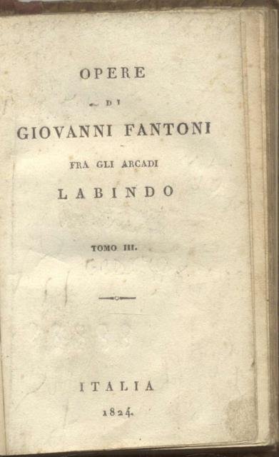 Cm.14,2x8,4. Pg.208. Legatura in mz.tela con piatti marmorizzati. Tassello con titoli in oro al dorso. Nel volume: "Epitalamj (per le nozze di Lorenzo Sangiantoffetti e Lucrezia Nani), Anacreontiche, Sonetti, Epigrammi (Ad Antonio Lei di Modena), Odi, Idilli, Elegie, Abbozzi, Inni, Idilli, Sonetti (ad Angiola Giorgieri nata Brunetti), Elogi funebri (Antonio Anselmi di Carrara)". Il volume costituisce il terzo ed ultimo tomo delle opere del Fantoni. > Parenti, "Dizionario dei luoghi di stampa falsi, inventati o supposti", 216, segnala una edizione delle "Poesie" di Labindo in tre volumi con l'indicazione di stampa "Italia, 1823", annotando: "Opera stampata a Firenze". Codice libreria 97877.