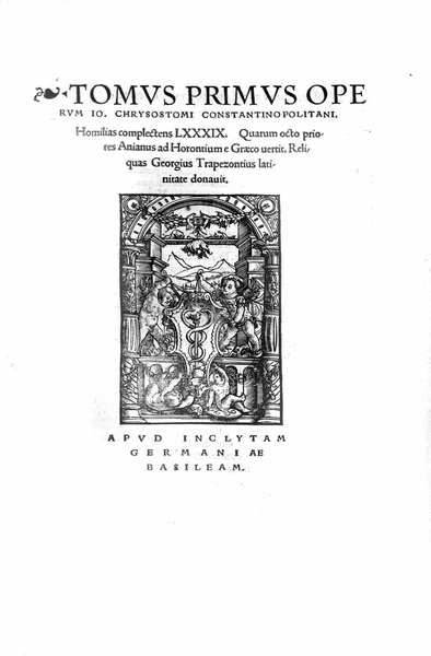 In-4 p. (mm. 296x202), 2 volumi, p. pergam. coeva (dorso a cordoni restaur.), con i 5 tomi dell'opera + Indice. Rarissima "prima edizione" di questa importante opera, così suddivisa in questo esemplare:- Vol. I: Tomus Primus - contiene le "Homilia super Matthaei Evangelium": Homilias complectens LXXXIX. Quarum octo priores Anianus ad Horontium e Graeco vertit, Reliquas Georgius Trapezontius latinitate donavit, 158 cc.num. + Tomus Quintus - contiene "Operum Divi Ioannis Chrysostomi": Homilias XLV - De dignitate sacerdotali Li. VI - De conpunctione cordis Li. II - De reparatione lapsi Li. unicum - De providentia Dei Li. III - Sermones XXXVI. Quorum omnium argumenta comperies pagina sequenti, 129 cc.num. (con grande marca tipografica al verso dell'ultima c.), 1 c.b. + "Index" super quinque tomos Operum Divi Ioannis Chrysostomi Episcopi Constantinopolitani. Vita eiusdem obiter ex Svida. atque ex aliis ecclesiasticis scriptoribus apposita, 20 cc.nn., con un bellissimo frontespizio entro elaborata cornice figurata su fondo nero, in silografia.- Vol. II: Tomus Secundus - continens "Commentarium in Ioannis Evangelia", Homilias vide licet LXXXVII. Francisco Aretino interprete, 91 cc.num., 1 c.b. + Tomus Tertius - contiene le "Homilias super epistolas Pauli": De laudibus Pauli Homilias VIII. incerto Interprete - In epistolam ad Titum Homilias VI. Ambrosio Camaldulensi interprete - In epistolam ad Philemonem Homilias III. Ambrosio Camald. interprete - In epistolam ad Hebraeos Homilias XXXIIII. Mutiano Scholastico interprete - In epistolam I ad Timotheum Homilias XVIII. incerto interprete - In epistolam II ad Timotheum Homilias X. incerto interprete - In epistolam ad Corinthios Homilia unica, Hieronymo Donato interprete - Adversus Vituperatores vitae monasticae libros III, Ambrosio Camald. interprete, 129 cc.num., 1 c.b. con grande marca tipograf. incisa + Tomus Quartus - habet "Homilias LXXX ad populum Antiochenum" potissimum habitas, Bernardo Brixiano Interprete, quarum argumenti compendium vide pagina sequenti, 109 cc.num., 1 c.nn. con marca tipograf. incisa.Tutti i tomi portano la bella marca tipografica al frontespizio e sono ornati da 11 pregevoli grandi capilettera xilografati su fondo nero. Cfr. Graesse,I,151.Esemplare su carta distinta ben conservato. "S. Giovanni Crisostomo (Antiochia fra il 344 e il 347 - Cumana, Cappadocia, 407), Padre della Chiesa, il più celebre degli oratori sacri. La fama di oratore gli procurò il soprannome di "bocca d'oro". Dei numerosi scritti meritano di essere ricordati in particolare i tre libri Contro gli avversari della vita monastica; i sei del dialogo Sul sacerdozio; varie opere ascetiche (sulla verginità, contro coloro che tengono vergini coabitatrici, ecc); i commenti agli Atti degli Apostoli; i discorsi esegetici (sulle epistole di S. Paolo, sui Salmi, ecc.) in cui segue il metodo della scuola antiochena; morali (contro i teatri e i giochi del circo); Sui misteri (per le grandi solennità); apologetici (contro gli Ebrei; contro gli anomei, ecc..). La sua personalità è soprattutto quella di un moralista, desideroso di riformare la vita cristiana, pur mantenendosi, culturalmente, nell'ambito dell'ellenismo". Cosi' Diz. Treccani,V, p. 404.