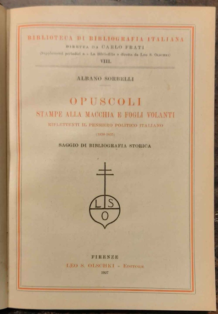 <p>25 cm, rilegatura in mezza pelle, titolo in oro al dorso, piatti marmorizzati, conserva la brossura originale; p. lxxxviii, 272. Descrizione di 964 opuscoli e stampe clandestine stampati fra il 1830 e il 1835. Comprende indice dei titoli e degli autori</p>