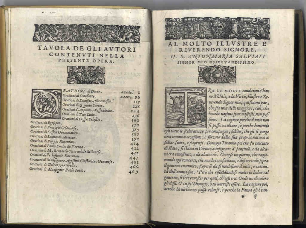 >in-8, (mm 215x140), pp. (16), 483, legatura settecentesca in piena pergamena rigida con unghie e tagli blu, titolo e tipografo elegantemente calligrafati al dorso. Prima edizione di questa raccolta di orazioni di storici latini, greci ed italiani curata da Remigio Nannini. Precede il testo la dedica all'illustre Reverendo S. AntonMaria Salviati. Impresa tipografica al titolo, finalini, testatine e capilettera ornati n.t. Contiene tra le altre le orazioni di: Dione, Senofonte, Quinto Curtio, Appiano Alessandrino, Tito Livio, Crispo Salustio, Egesipio, Procopio Cesariense, Leonardo Aretino, Poggio Fiorentino ed altri. Remigio Nannini o Nanni, conosciuto più comunemente come Remigio Fiorentino (Firenze 1521-1581) visse quasi sempre a Venezia, fu frate domenicano, uomo di profonda cultura, poeta, editore, scrittore politico e traduttore (tra l'altro tradusse i ''Rimedi dell'una e dell'altra fortuna'' di Petrarca e la ''Storia de' costumi de' popoli settentrionali'' di Olao Magno). Esemplare in perfetto stato di conservazione. Al contropiatto anteriore ex-libris inciso tardo settecentesco - con stemma marchionale della panoplia con lo scudo con al centro una stella - della famiglia Dionisi, tra le più antiche della nobiltà di Verona: il marchese Gabriele (1719-1808) fu l'artefice della ristrutturazione della villa a Ca' del lago di Cerea nonché del riordino e aggiornamento della biblioteca. La famiglia Dionisi aveva destinato al piano nobile la funzione di libreria e sala di lettura, precoce esempio di centro culturale dove si riunivano artisti e letterati. Dopo la dispersione delle migliaia di volumi del fondo antico, conserva ora i libri sul mobile d'arte contemporaneo della Fondazione Aldo Morelato. Bongi, Annali di Gabriel Giolito de' Ferrari, II, pp.125-126. Adams, O-242. STC Italian Books, p. 460. Gamba p. 452. Negri, Scrittori Fiorentini, p. 481.
