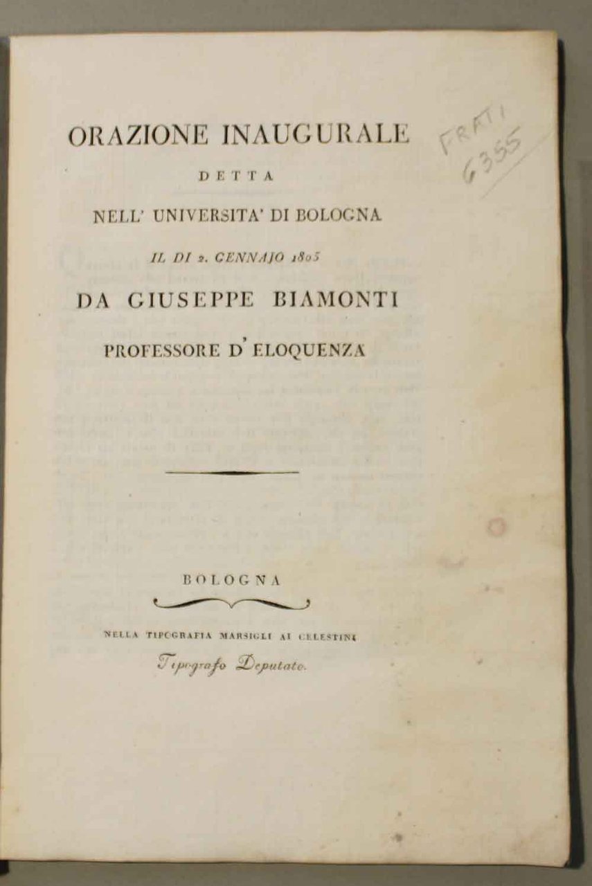 Orazione inaugurale detta nell'Università di Bologna il di 2 gennaio 1805