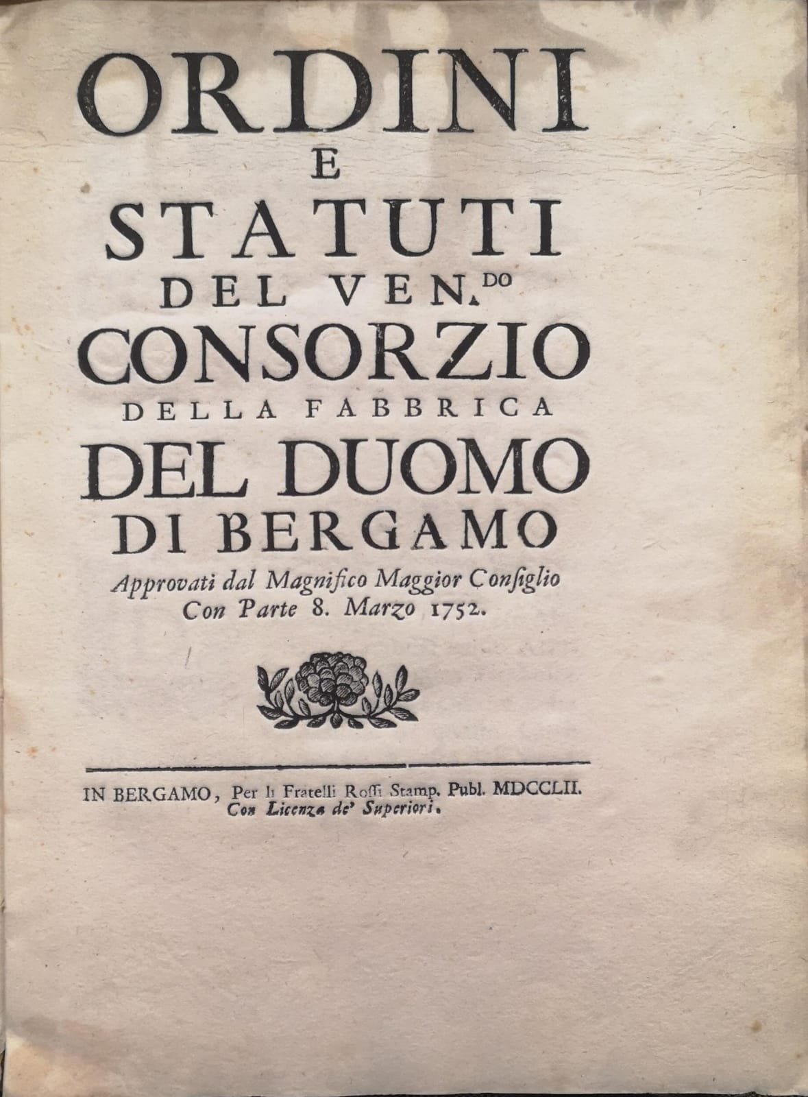 ORDINI E STATUTI DEL VEN.DO CONSORZIO DELLA FABBRICA DEL DUOMO DI BERGAMO APPROVATI DAL MAGNIFICO MAGGIOR CONSIGLIO CON PARTE 8. MARZO 1752.
