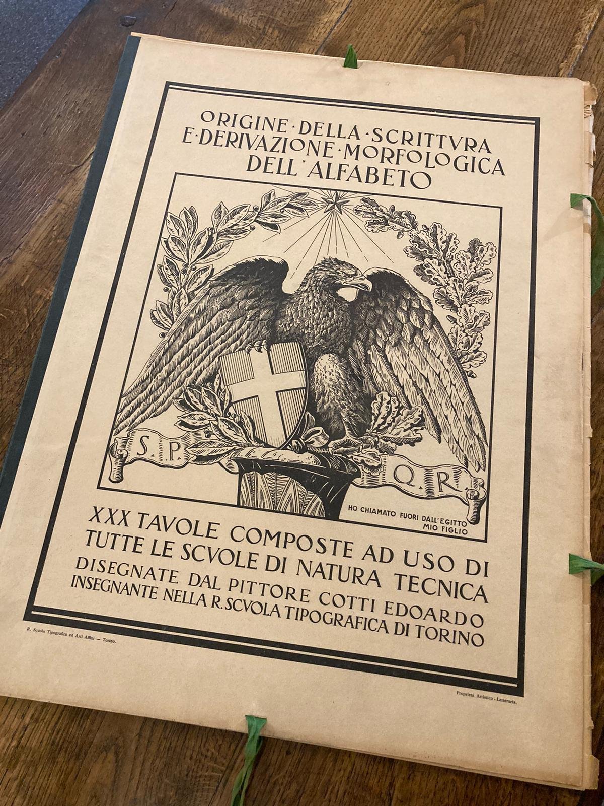 Grande cartella di XXX tavole murali stampate in litografia, formato cm 50 x 70. Legatura editoriale in cartella con dorso in tela e laccetti conservati. Ottimo esemplare. Tav. I, Periodo Mnemonico; Tav. II, Periodo Figurativo; Tav. III, Periodo Figurativo-Simbolico; Tav. IV, Periodo dei Geroglifici; Tav. V, Periodo dei Geroglifici; Tav.VI, Periodo Figurativo Ieratico Alfabetico; da Tav. VII a Tav. XXX A, B, C, D, E, F, G, H, I, K, L, M, N, O, P, Q, R, S, T, U, V, X, Y, Z.