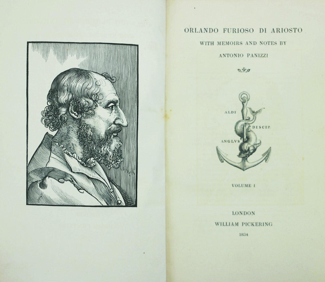 In-16 gr. (mm. 191x110), 9 volumi, elegante legatura d'epoca in p. marocchino verde, sottili cornici dorate ai piatti, dorso a cordoni con ricca decoraz. e titolo oro, dentelles dorate, tagli dorati. L'edizione (con il saggio, le note, le vite, i commenti, in lingua inglese) è così composta: - "Orlando Innamorato" di Boiardo, 5 volumi, pp. XX,422; VII,CLIV.252; (6),386; (6),379; (6),391. Al saggio sulla poesia è dedicato tutto il primo volume che contiene anche una tavola genealogica sui più famosi paladini ed eroi celebrati nell'epopea di Carlo Magno. Il poema è introdotto da una vita del Boiardo. - "Orlando Furioso" dell'Ariosto, 4 volumi, pp. VIII,CLXXVI,198; (4),436; (4),424; (4),330; con ritratto dell'A. disegnato dal Tiziano. Vi è anteposta una vita dell'Ariosto scritta dall'editore Antonio Panizzi, il quale aggiunse sue note alla fine di ogni volume dei due poemi. Accompagnano questa bella ristampa le Notizie bibliografiche' dell'Orlando. A tutti i frontespizi marca tipografica con l'ancora aldina e la scritta Aldi Discip. Anglus. Cfr. Gamba,65: Ottima edizione - Agnelli/Ravegnani,I, p. 228: Pregiatissima edizione - Choix de Olschki,XII,18331 - Brunet,I,439: édition où l'on remarque de bonnes notices bibliographiques.Bell'esemplare, con ex libris alle armi di Thos Gaisford.