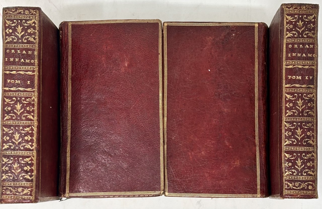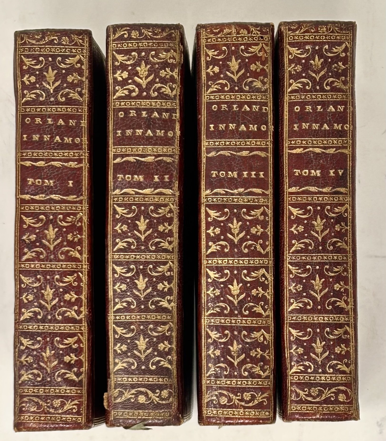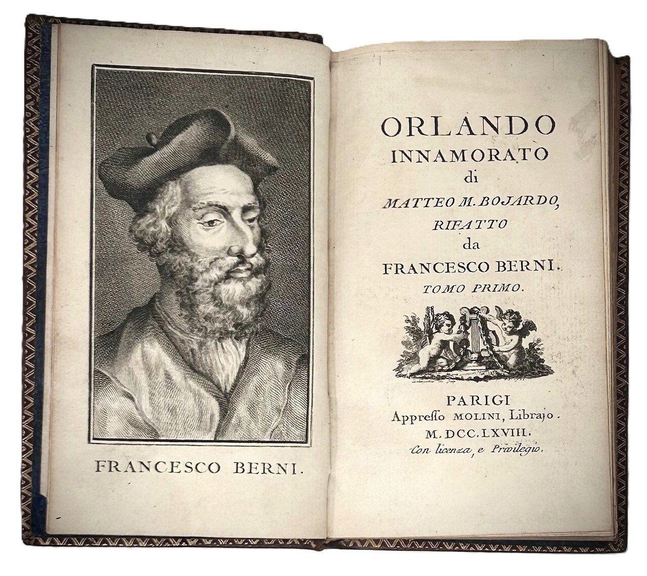 >4 vol. in-8 (158x90mm), pp.(4), IV,395; (2), 409; (2), 410; (2), 396. Bel ritratto del Berni inciso in antiporta al I volume, vignetta incisa sui quattro titoli, fregi tipografici n.t. Splendida legatura francese del tempo in pieno marocchino granata, bordura a filetti sui piatti, dorsi ornati con titoli e fregi oro, dent. int., tagli dor. Ottima edizione di questo famoso romanzo di cavalleria del Boiardo (di Scandiano 1434-1494) la cui prima edizione, conosciuta in unico esemplare, è del 1486. L'Orlando Inammorato fu aumentato e rifatto da Fr. Berni nel XV-XVI secolo, quindi rivisto da Nicolò degli Agostini e da Lodovico Domenichi. Edizione assai curata, nel testo e nell'impressione tipografica. Esemplare di grande freschezza e qualità. Melzi. Romanzi cavallereschi, pp.69-97 e n.176.
