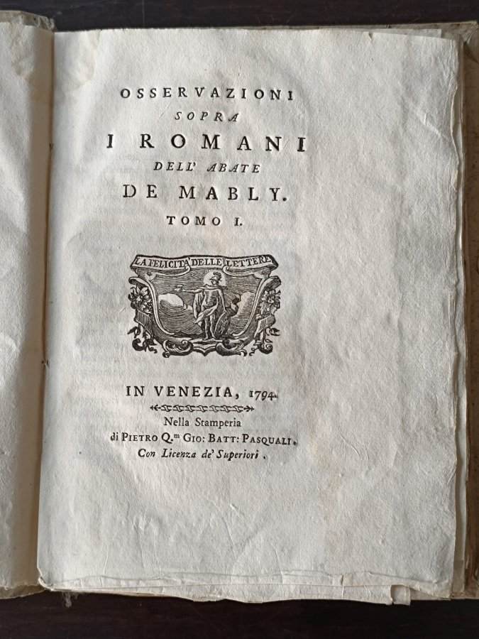 <span style="font-style: normal;">2 volumi in-8° (cm. 18,4), legature coeve in cartonato alla rustica con titolo anticamente manoscritto ai dorsi (alcune mancanze e alcune tracce d'uso); pp. [8] 182 [2b], 183 [1b] in barbe, in stato molto buono (lievi gore alle sole prime carte del tomo I). Gabriel Bonnot de Mably si annovera tra le principali figure della politica estera del Settecento francese. Questa interessante e non comune opera è dedicata a costumi e istituzioni dell'epoca romana che fungono da </span><i>exemplum</i> per i tempi contemporanei all'autore. Per la prima edizione italiana (1766) cfr. Brunet III, 318; Graesse IV, 318. Antiche firme di possesso ai contropiatti. Buon esemplare. (NB9)