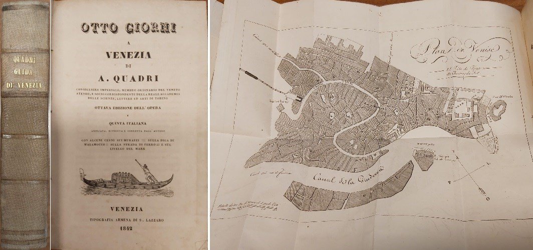 in-16, pp. LII, 442, leg. t. tela con tit. oro al d. Con 3 carte topogr. raff. il porto di Malamocco, la laguna e la pianta di Venezia. Con una incis. in rame al front. raff. la gondola veneziana. E’ la prima parte come si legge sull’occhietto ma a se stante dato che la seconda parte uscì nel medesimo anno recando un tit. diverso “Compendio della storia veneta diviso in otto epoche”. Fossati-Bellani 2295. Cicogna 4491. Ediz. mancante al Lozzi. Bell’esempl.