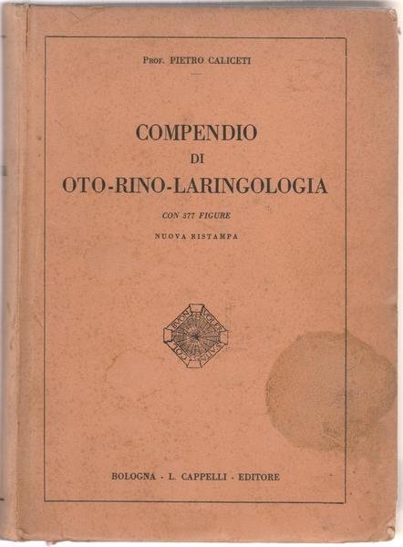 P. CALICETI COMPENDIO OTO-RINO-LARINGOLOGIA CAPPELLI ED. 1931 L5861 COPERTINA RIGIDA EDITORIALE CON EVIDENTE MACCHIA AL PIATTO ANTERIORE, ALCUNE MACCHIE AL DORSO, ANGOLI LEGGERMENTE DEFORMATI, TAGLI CON FIORITURE, INTERNO IN BUONO STATO ALCUNE LEGGERE FIORITURE ALLE PAGINE CHE NON DISTURBANO LA LETTURA, NUMEROSE ILLUSTRAZIONI IN B/N E A COLORI, N. PAG. 821 CM. 24,5 X 18 X 5
