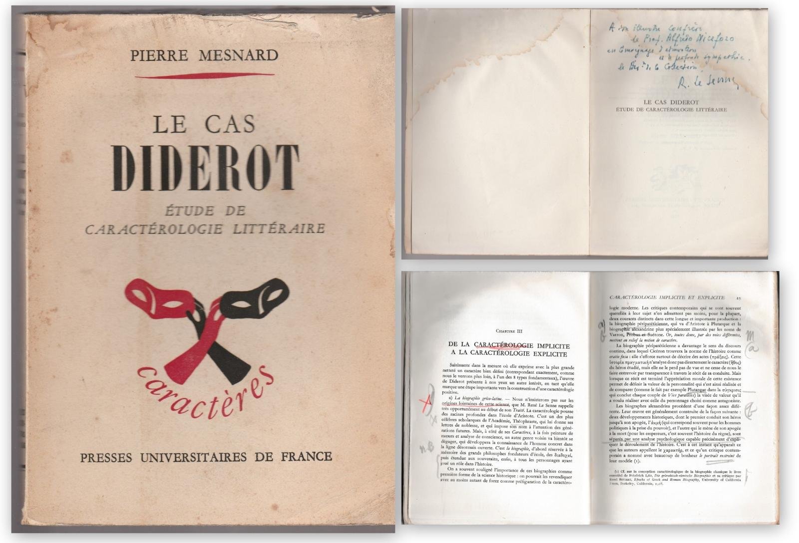 P. MESNARD LE CAS DIDEROT ETUDE DE CARACTEROLOGIE LITTERAIRE†PRESS UNIVERSITARIE DE FRANCE 1952 L5035 COPERTINA MORBIDA EDITORIALE CON MACCHIE AL PIATTO ANTERIORE, DORSO CON PICCOLE SPELLATURE AI MARGINI E UNA MACCHIA, MACCHIA DI UMIDITA' ALL'ANGOLO SUPERIORE CHE VA VIA VIA DIMINUENDO ALL'INTERNO DEL LIBRO MA PRESENTE SU TUTTE LE PAGINE, DEDICA ALL'ANTIPORTA, SEGNI DI MATITA ROSSOBLŸ ALLE PRIME 40 PAGINE E DUE SEGNI DI MATITA GRIGIA AL MARGINE DELLE PAGINE, UNA LIEVE MACCHIA AL MARGINE STERNO ALL'ULTIMA PAGINA BIANCA N. PAG. 246 CM. 19 X 14