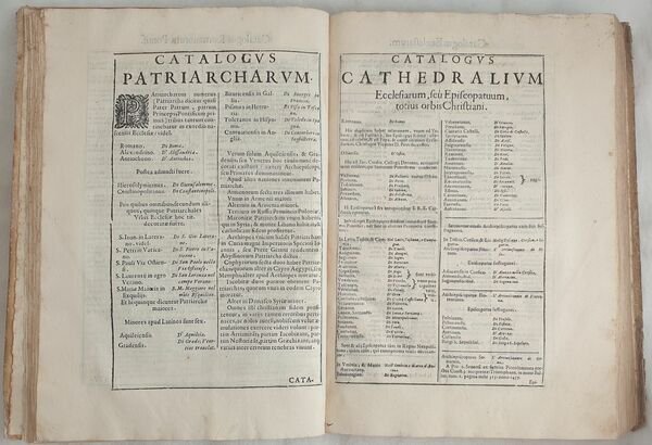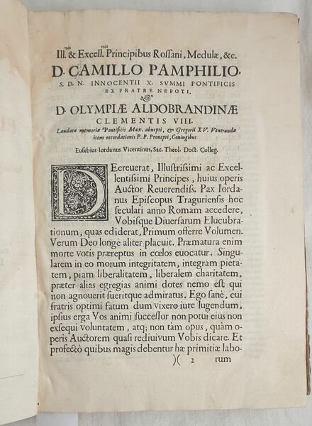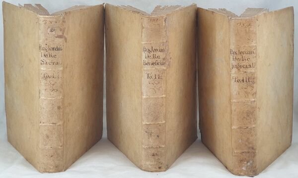 Bella edizione del 1650 di questa opera di diritto canonico di Giordani Pace da Vicenza, Vescovo della Diocesi di Tragù (Diocesi orami estinta che comprendeva parte della Dalmazia centrale nell'odierna Croazia). L'opera è composta da tre tomi ed è completa. Antiporta calcografica incisa da Giovanni Georgi con stemma dei dedicatari Camillo Panfili e Olimpia Aldobrandini. Le opere contenuti nei volumi: De Re Sacra (consacrazione dei Vescovi, Ufficio dei Vescovi, Benedizione Abati, Consacrazione della Chiesa, Benedizione del cimitero, Indulgenze ecc.), Trophaeum militantis ecclesiae (con proprio frontespizio, contenente lista dei Pontefici, Patriarchi, Vescovi della Cattedrale, Abati,) De Re beneficiaria (Costituzioni, sinodo Dicoesana, Visitazione del Capitolo, Dispense, Benefici, Processioni, Immunità, processioni, immunità ecclesiastica, Costituzioni varie ecc.), De Re Iudiciali (Foro competente, Recusazione, Giurisdizione ordinaria, Arbitrio, Procure, Dolo e contumacia, Testimoni, Fede, Eccezioni, Prescrizioni, Sentenza, Appelli, Atti di trasporto, Supplica ecc.). In buone condizioni e completo. Copertina in piena pergamena con titolo al manoscritto al dorso in ottime condizioni generali con lievi usure marginali. Legatura in buone condizioni. Pagine in buone condizioni con fioriture. Occasionali segni di tarlo marginali non inficianti il testo. Lievi gore marginali al tomo primo e secondo. In folio. Dim. 33x23,5 cm. Pp. (62)+446+(2), (14)+604, (28)+619+(1).Peso Kg. 5,300Beautiful edition of 1650 of this work of church right by Giordani Pace da Vicenza, Byshop of the Diocesis of Tragù (to which belonged part of Dalmazia centrale in the modern Croazia). The work is amde up of three toms and it is complete. Calcographic frontspice engraved by Giovanni Georgi with coat of arms of the dedicataries Camillo Panfili and Olimpia Aldobrandini. The works contained in the volumes: De Re Sacra (Consacration of Byshops, Consacration of churches, Blessing of cemetery, Indulgences ecc.), Trophaeum militantis ecclesiae (with its own title page, list of popes, Byshops of cathedral, Abati,) De Re beneficiaria (Constitutions, Visit of chapter, Benefits, processions, Immunity, church immunities ecc.), De Re Iudiciali (Foro competente, Recusazione, Giurisdizione ordinaria, Arbitrio, Procure, Dolo e contumacia, Testimonies, Faith, exceptions, Prescriptions, Acts of transport ecc.). In good conditions and complete. Full parchment coeval cover with handwritten title in the spine in very good general conditions lightly worn in the extremities. Binding in good conditions. Inside pages are in good conditions with foxing. Scarce worming in the extremities not ruining the text. Light dump stains in the extremities of first and second tome. In folio. Dim. 33x23,5 cm. Pp. (62)+446+(2), (14)+604, (28)+619+(1).Peso Kg. 5,300