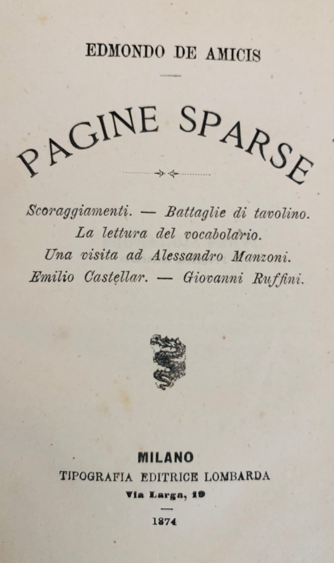 >in-8 (180x120), pp. 143, (3) e 6 di catalogo editoriale. Deliziosa legatura realizzata espressamente come Premio per le "Scuole Municipali di Torino", percallina verde, titolo aro al dorso ed al centro del piatto superiore. Edizione originale alla quale seguirono numerose ristampe. “Sebbene costituita da articoli pubblicati in varie occasioni, fu molto letta, e alcuni degli scritti della raccolta sono anche oggi conosciutissimi”. (Dino Provenzal, in Dizionario Bompiani delle Opere, V, 357). L'opera è così suddivisa: Pagine sparse. Scoraggiamenti - Battaglie di tavolino - La lettura del vocabolario - Una visita ad Alessandro Manzoni - Emilio Castelar - Giovanni Ruffini. Mancante del ritratto di De Amicis.