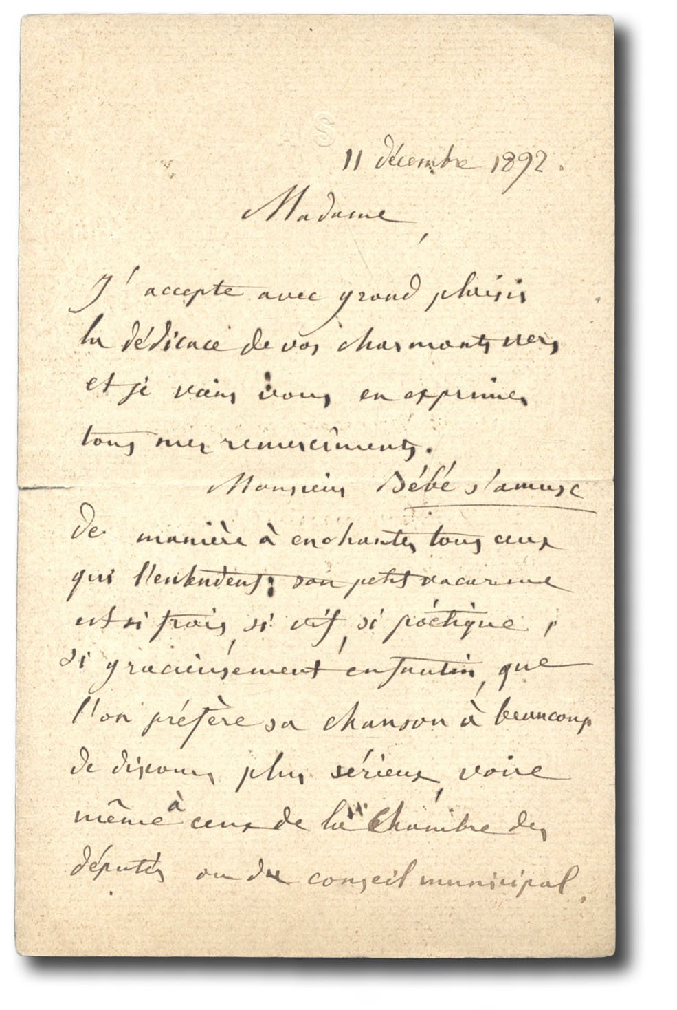 >L.a.f., 2 p. 1/2 in-8, s.l., 11 ottobre 1892, concernente un certo monsieur Bébé (poeta, deputato, candidato à l'Académie): «Madame, j'accepte avec grand plaisir la dédicace de vos charmants vers...Monsieur Bébé s'amuse de manière à enchanter tous ceux qui l'entendent...Maintenant Bébé va-t'il se présenter à l'Académie...peut être celle de Bébé est-elle un peu enfantine pour nos graves académiciens...».