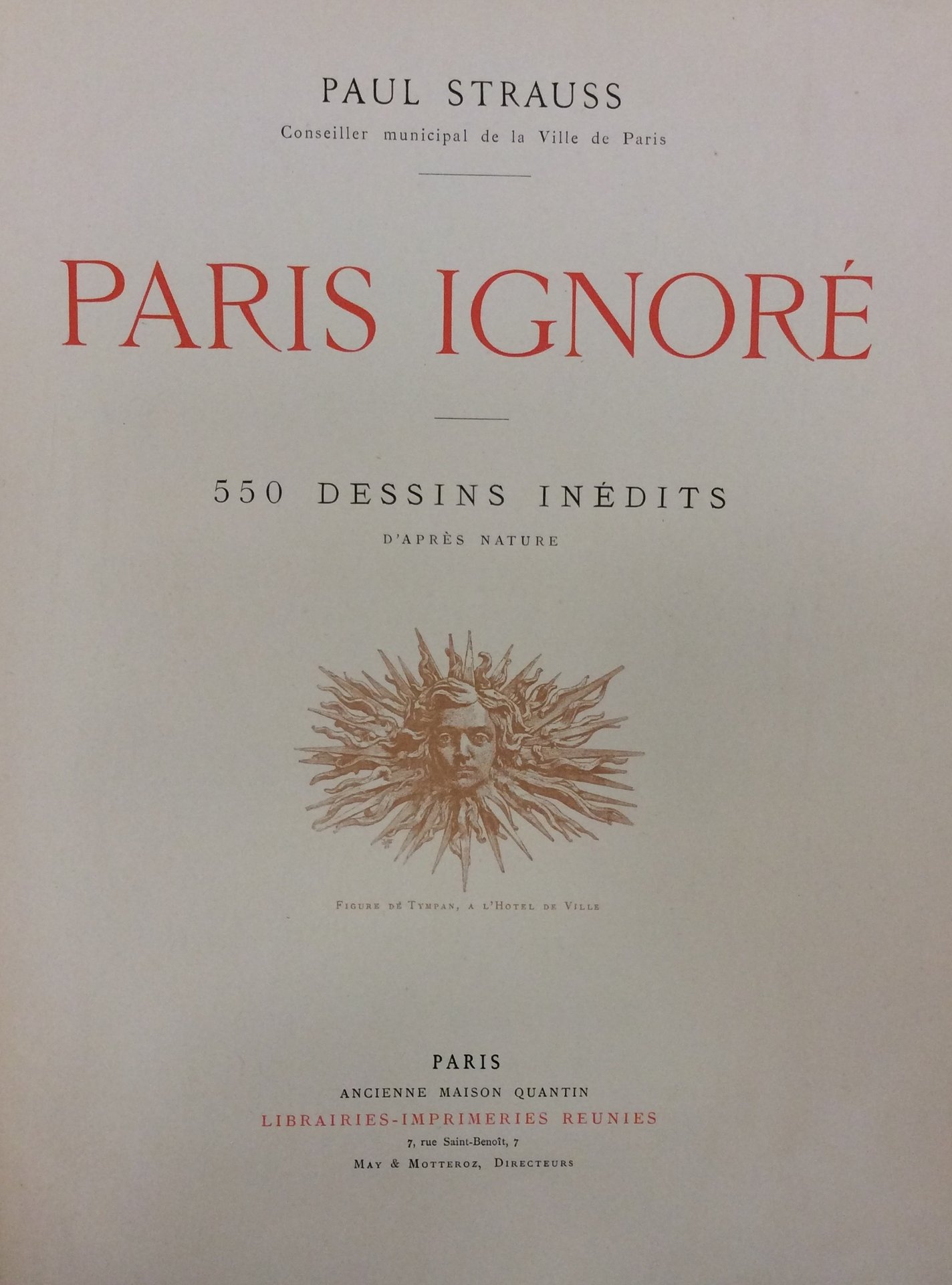 In-4 gr., mz. tela edit. con ang., bella illustrazioni impressa al piatto e al dorso con titolo oro, taglio sup. dorato, pp. 486, molto ben illustr. da 550 disegni, di cui numerosi a piena pag., sulla Parigi minore di fine secolo: "Les Halles et marchés, la Bourse, les égouts, le gaz et l'electricité, le port de Paris, les postes, les pompes funèbres et cimitières, les pompiers, les prisons, les écoles, lycées et collèges, les hopitaux, etc." Prima edizione. Cfr. Lorenz,15,862. Esempl. con ex libris, ben conservato.
