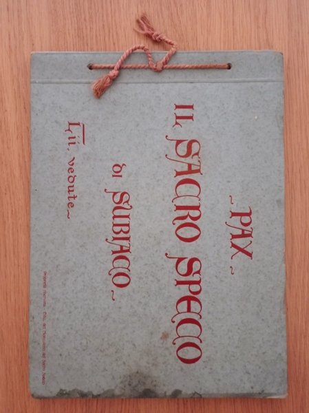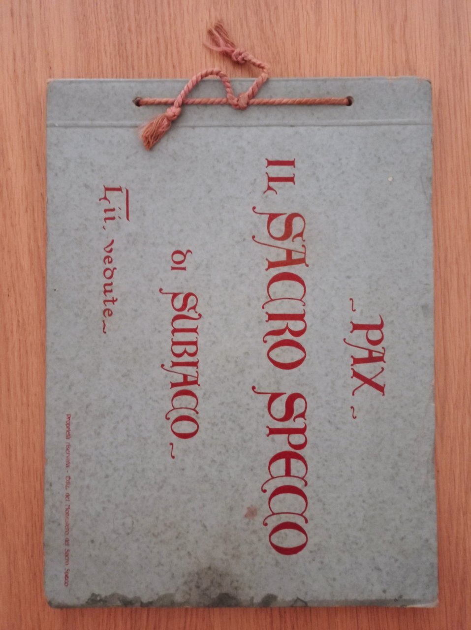 Volume senza data riportata sicuramente della seconda metà del 1900. Comprende 52 fotografie della veduta del Monastero del Sacro Speco di Subiaco. Copertina flessibile ombrata e macchiata sul fronte. Pagine molto ingiallite con gore e fioriture. Buono (Good) .