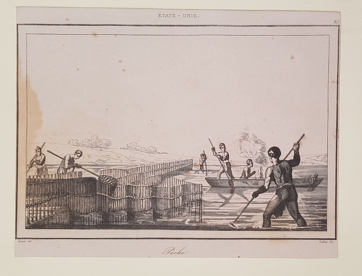 Veduta animata del 1838 circa che mostra indiani nativi mentre pescano montata in passepartout. Data: 1838 circa Tecnica: acquaforte Dimensione foglio: 17,5x25 cm Dimensione incisione: 11,5x15 cm Condizioni: Buone. Rare fioriture.Nice view of Native Indians fishing of 1838 circa mounted in a passepartout. Date: 1838 circa Technique: Steel etching Passepartout Dimension: 17,5x25 cm (6.9x9.8 inches) Engraving Dimension: 11,5x15 cm (4.5x5.9 inches) Conditions: Good conditions. Some foxings.