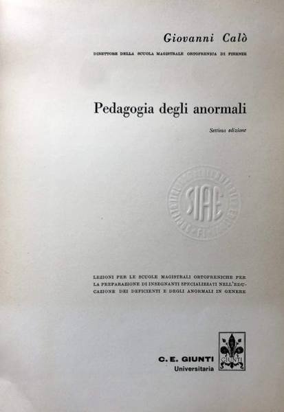 PEDAGOGIA DEGLI ANORMALI: LEZIONI PER LE SCUOLE MAGISTRALI ORTOFRENICHE PER LA PREPARAZIONE DI INSEGNANTI SPECIALIZZATI NELL'EDUCAZIONE DEI DEFICIENTI E DEGLI ANORMALI IN GENERE | Libros antiguos y modernos | Giovanni Calò
