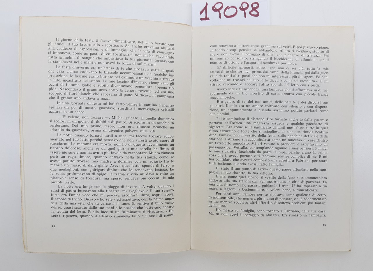 legatura morbida editoriale in condizioni accettabili con una lieve piega all'angolo superiore ed inferiore del piatto anteriore, una piega al margine interno del piatto anteriore, lievi segni di usura e lievi aloni ai piatti, tagli ingialliti con qualche sporcizia, interno in discreto stato, numero pagine 71 + indice dimensioni cm 21,7 * 15,8