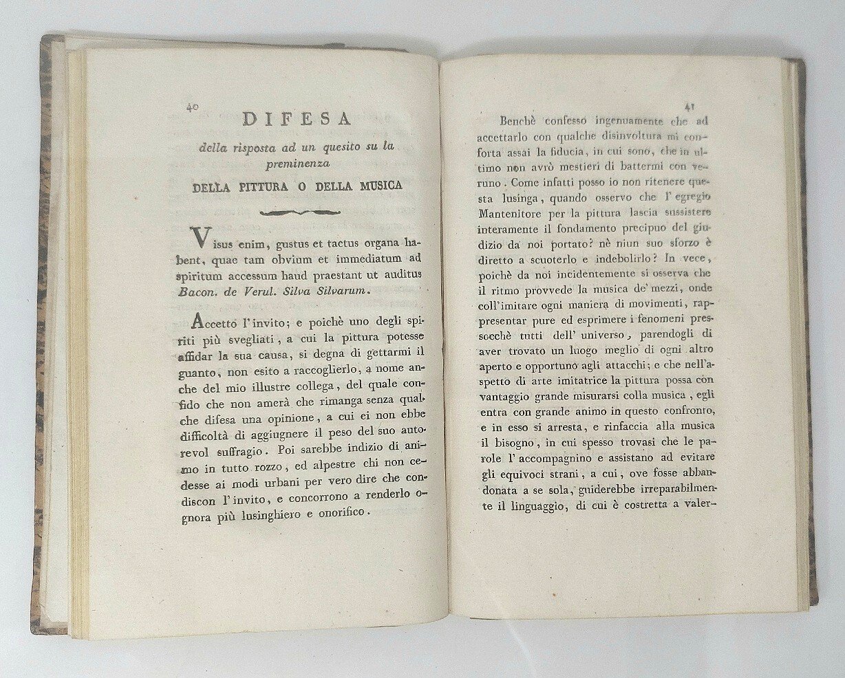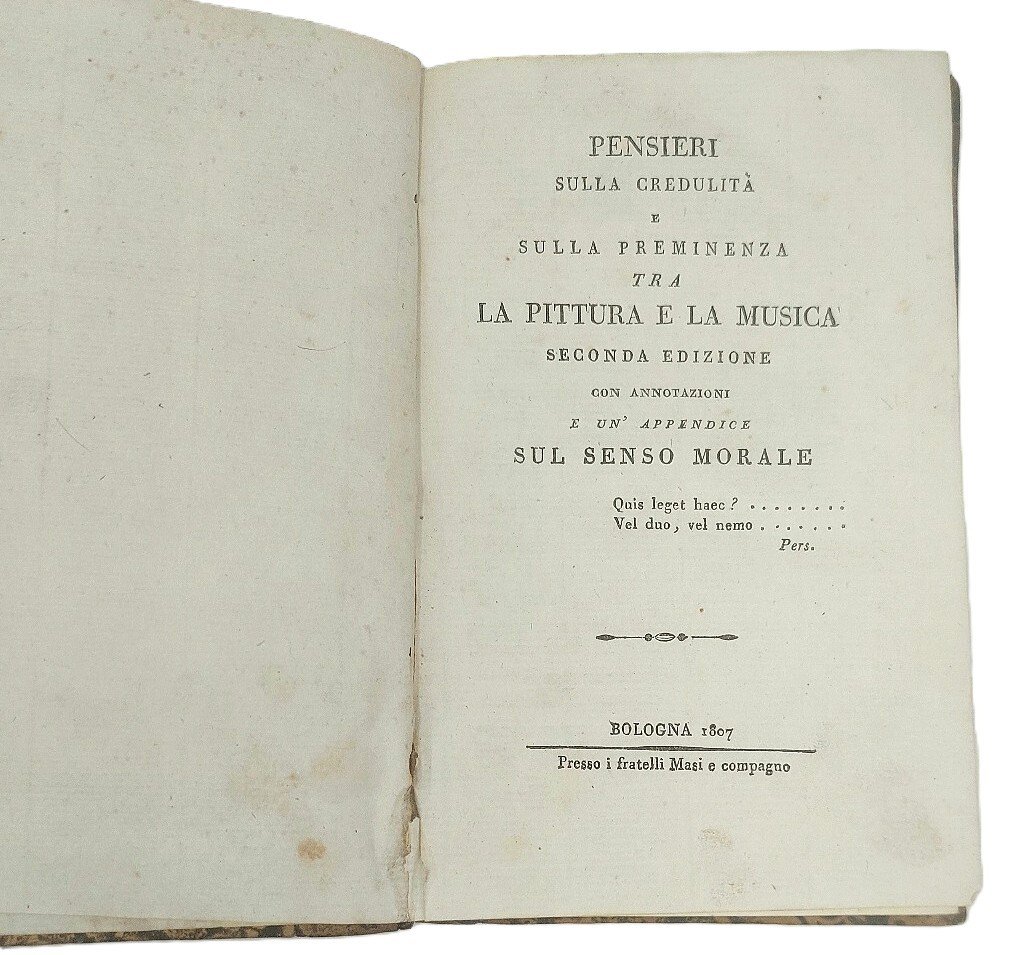 >in-8, pp. (4), 94, (2), leg. coeva m. pelle, fregi in oro al dorso (cerniere deboli e cuffie con mancanze). Dotti pensieri e riflessioni relativi alla controversia su la preminenza della pittura o della musica. Michele Araldi (Modena 1741-Milano 1813), fu medico e filosofo, ricoprì vari incarichi pubblici e professionali. Saggio curioso e non comune, tra Illuminismo e Pirronismo:"inestimabili sono i vantaggi dovuti al principio della credulità . Senza di esso non vi sarebbe istruzione ... Dirà taluno: voi nell'affidare la prima istruzione alla credulità, dimenticate un altro principio ammesso da tutti,che basta all'uopo: quello dell'associazion delle idee...". Esemplare internamente molto fresco, con ampi margini. Melzi, Opere anonime, II, p. 328.Diz. biografico Italiani, III, 705.