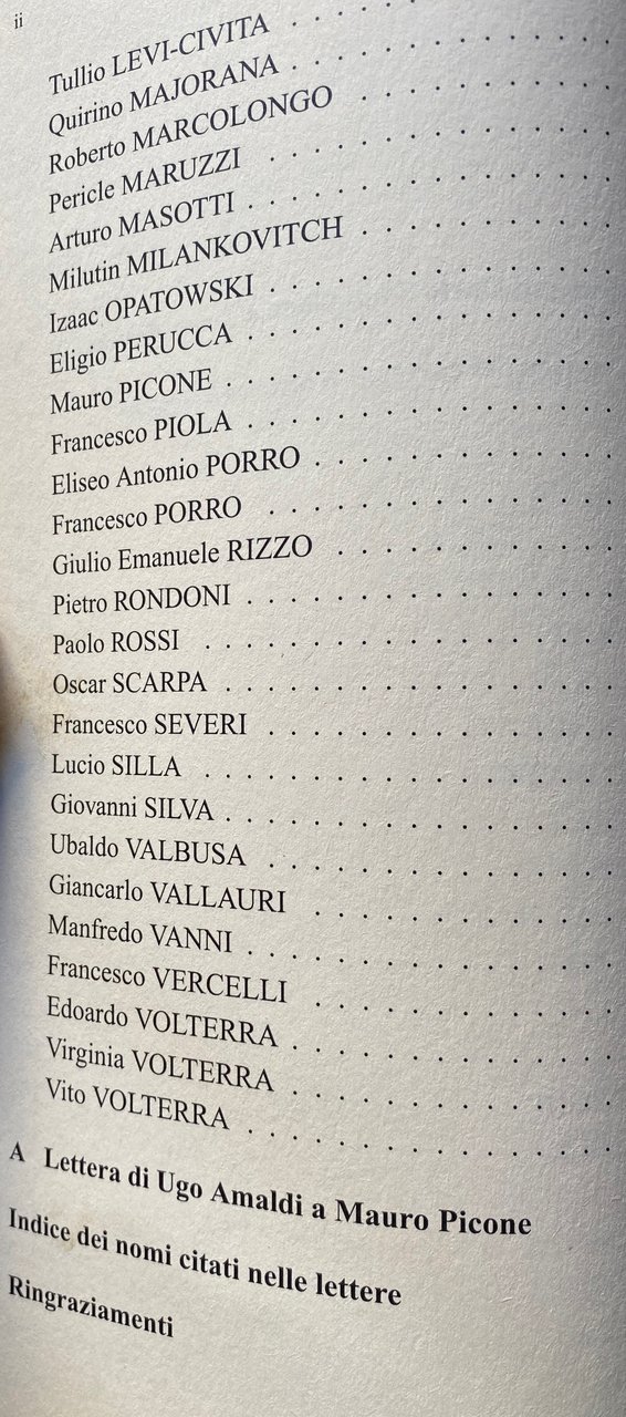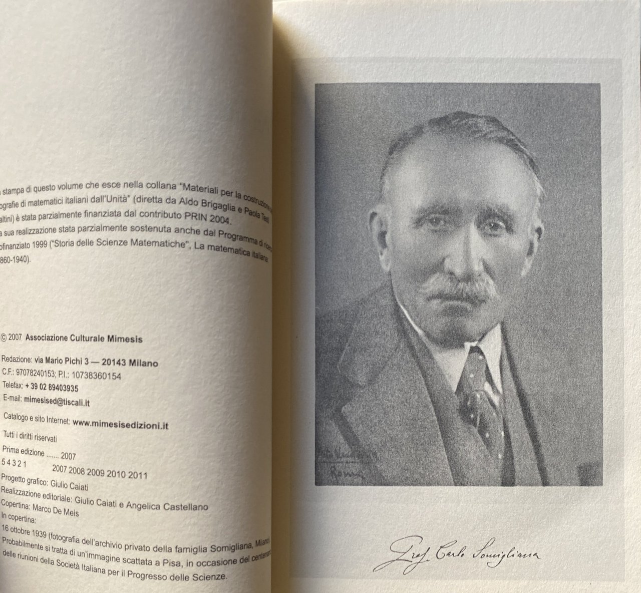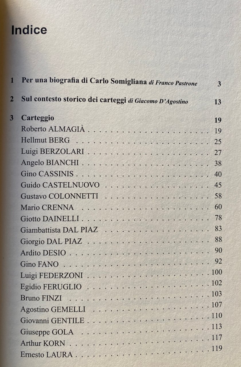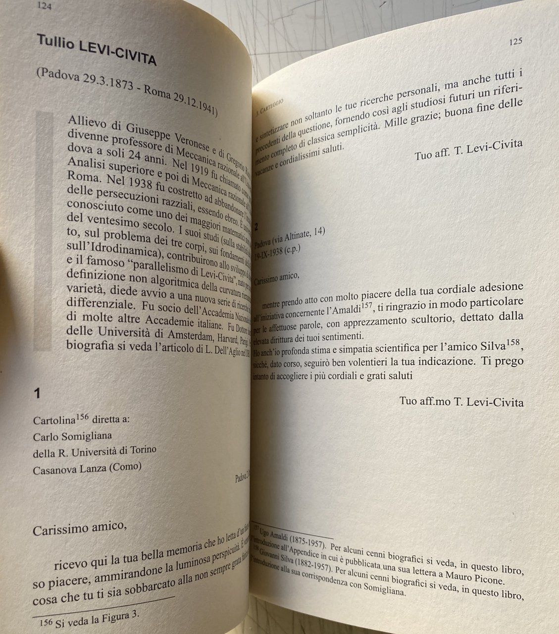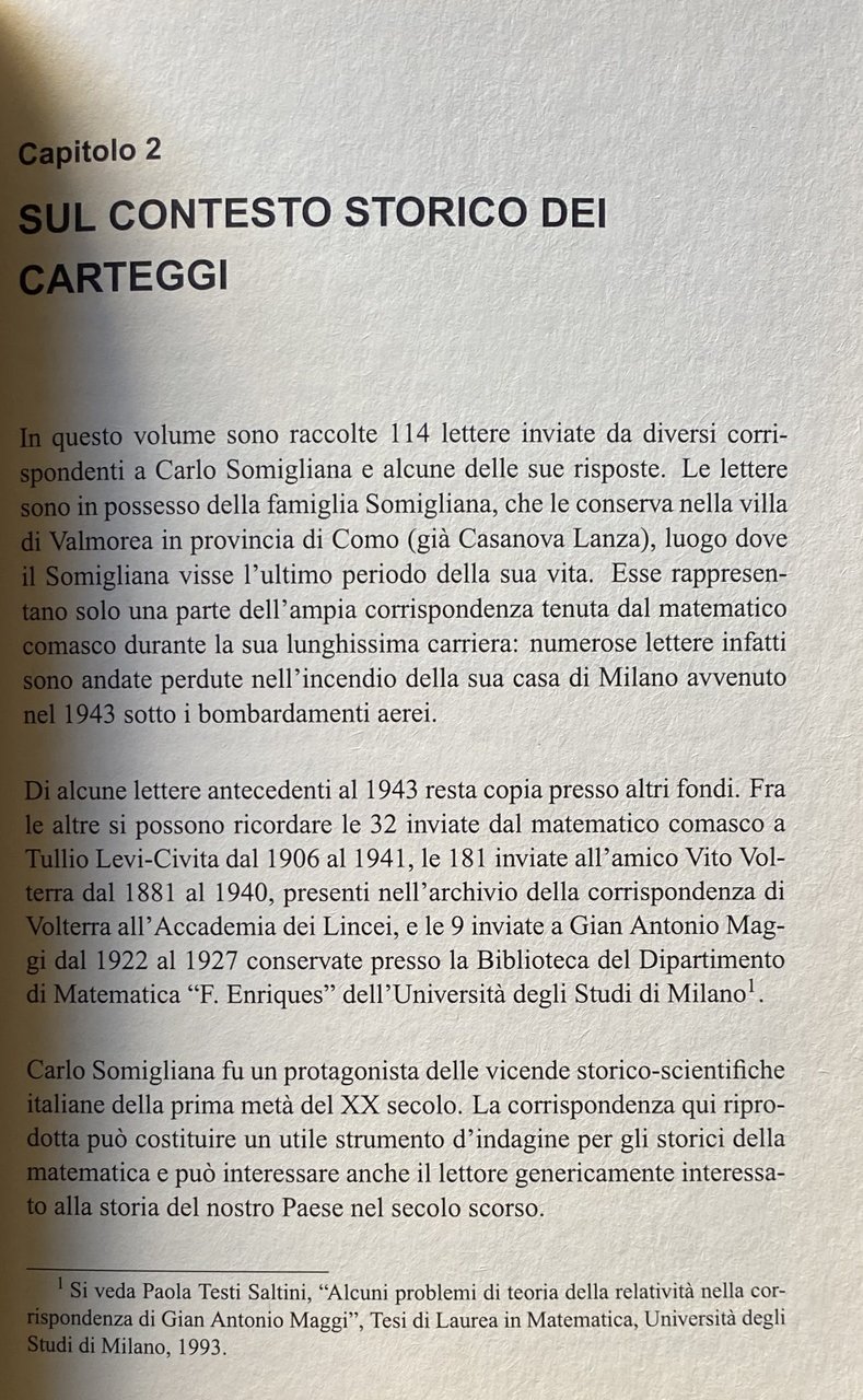 Il volume raccoglie le lettere spedite a Carlo Somigliana (1860-1955) negli anni che vanno dal 1930 al 1955. (Tra i 42 corrispondenti sono presenti alcuni dei protagonisti del dibattito scientifico del Novecento come Guido Castelnuovo e Vito Volterra). Le lettere forniscono elementi di riflessione su alcuni momenti significativi della storia delle istituzioni scientifiche del nostro Paese nel XX secolo: l'allontanamento dall'insegnamento dei professori di origine ebraica causa delle leggi razziali del 1938, il tentativo di ricostituzione dell'Accademia d'Italia nella RSI dopo i 25 luglio del 1943, la ricostruzione delle istituzioni scientifiche dopo la caduta del fascismo, il dibattito sula teoria della relatività nella comunità scientifica italiana.