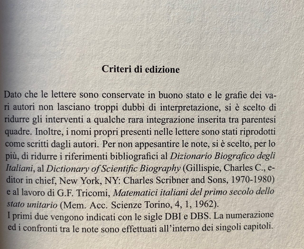Soggetti: Bibliografia, Biografie, Matematici, Scienze, Fascismo, Corrispondenza, Lettere, Carteggi, Memorie, Einstein, Fisica matematica, Storia, Scienze matematiche, Scienziati, Enrico Betti, elasticità, Formule, Ghiacciai, Bonaparte Colombo, Ettore Majorana, Accademia dei Lincei, Matematici italiani del XIX-XX secolo Collezionismo Libri rari fuori catalogo Localistica Storia locale Unità, Memorie, Intellettuali, Lettere, Carteggio, Epistolario, Cultura, Scienziati, Scienza, Fascismo, Storia d'Italia, Antisemitismo, Leggi razziali, Mussolini, Novecento, Didattica, Università, Professori, Accademici ebrei, Roberto Almagià, Hellmut Berg, Luigi Berzolari, Angelo Bianchi, Gino Cassinis, Guido Castelnuovo, Gustavo Colonnetti, Mario Crenna, Giotto Dainelli, Giambattista Dal Piaz, Giorgio Dal Piaz, Ardito Desio, Gino Fano, Luigi, Federzoni, Egidio Feruglio, Bruno Finzi, Agostino Gemelli, Giovanni Gentile, Giuseppe Gola, Arthur Korn, Ernesto Laura, Tullio Levi-Civita, Quirino Majorana, Roberto Marcolongo, Pericle Maruzzi, Arturo Masotti, Milutin Milankovitch, Izaac Opatowski, Eligio Perucca, Mauro Picone, Francesco Piola, Eliseo Antonio Porro, Francesco Porro, Giulio Emanuele Rizzo, Pietro Rondoni, Paolo Rossi, Oscar Scarpa, Francesco Severi, Lucio Silla, Giovanni Silva, Ubaldo Valbusa, Giancarlo Vallauri, Manfredo Vanni, Francesco Vercelli, Edoardo Volterra, Virginia Volterra, Vito Volterra, Ugo Amaldi, Mauro Picone Persecuzioni Repressione Censura Cultura Bibliography, Biographies, Mathematicians, Sciences, Fascism, Correspondence, Letters, Correspondence, Memoirs, Mathematical physics, History, Mathematical sciences, Scientists, Elasticity, Formulas, Glaciers, Italian mathematicians of the 19th-20th century Collecting Rare books out of print Localistics Local history Unity, Memories, Intellectuals, Correspondence, Letters, Culture, Scientists, Science, Fascism, History of Italy, Anti-Semitism, Racial laws, Twentieth century, Teaching, University, Professors, Jewish academics, Persecutions Repression Censorship Culture Meridionalismo