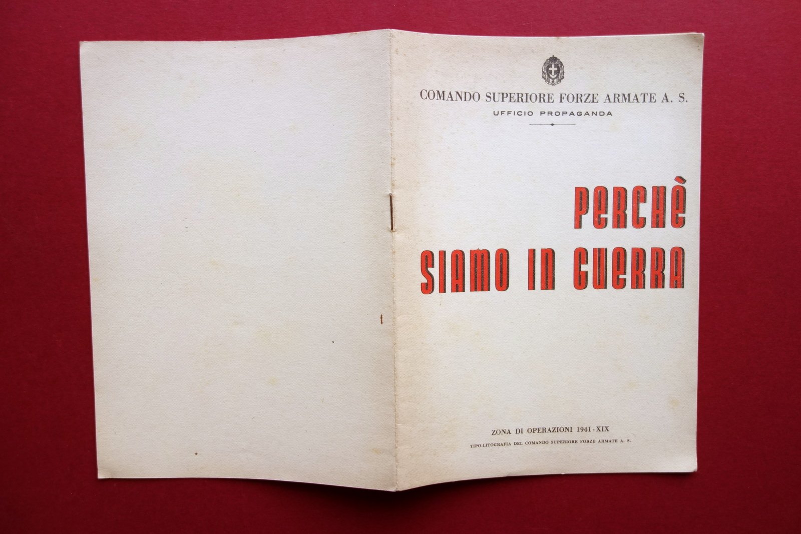 Alessandro Melchiori, Comando Superiore Forze Armate A. S. Ufficio propaganda - Perché siamo in guerra Tipo-Litografia del Comando Superiore Forze Armate A. S., Zona di Operazioni 1941; cm 21x15; pp. 16; brossura ed. Condizioni di conservazione Esemplare in buone condizioni con leggere tracce d'uso, alcune leggerissime bruniture principalmente alle brossure, marginali accenni di ingiallimento dovuti al tipo di carta. SC03.D16879 N