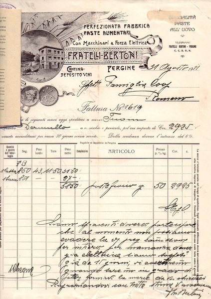 Perfezionata fabbrica paste alimentari con macchinari a forza elettrica Tito ed Emilio Bertoni: Pergine.