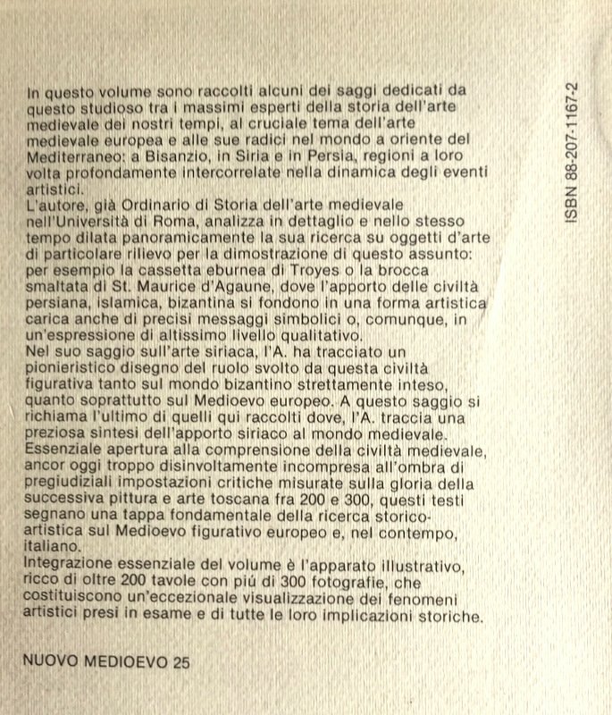 In questo volume sono raccolti alcuni dei saggi dedicati da questo studioso tra i massimi esperti della storia dell'arte medievale dei nostri tempi, al cruciale tema dell'arte medievale europea e alle sue radici nel mondo a oriente del Mediterraneo: a Bisanzio, in Siria e in Persia, regioni a loro volta profondamente intercorrelate nella dinamica degli eventi artistici. L'autore analizza in dettaglio e nello stesso tempo dilata panoramicamente la sua ricerca su oggetti d'arte di particolare rilievo per la dimostrazione di questo assunto: per esempio la cassetta eburnea di Troyes o la brocca smaltata di St. Maurice d'Agaune, dove l'apporto delle civiltà persiana, islamica, bizantina si fondono in una forma artistica carica anche di precisi messaggi simbolici o, comunque, in un'espressione di altissimo livello qualitativo. Nel suo saggio sull'arte siriaca, l'autore ha tracciato un pionieristico disegno del ruolo svolto da questa civiltà figurativa tanto sul mondo bizantino strettamente inteso, quanto soprattutto sul Medioevo europeo. A questo saggio si richiama l'ultimo di quelli qui raccolti dove l'autore traccia una preziosa sintesi dell'apporto siriaco al mondo medievale. Essenziale apertura alla comprensione della civiltà medievale, ancor oggi troppo disinvoltamente incompresa all'ombra di pregiudiziali impostazioni critiche misurate sulla gloria della successiva pittura e arte toscana fra 200 e 300, questi testi segnano una tappa fondamentale della ricerca storico-artistica sul Medioevo figurativo europeo e, nel contempo, italiano. Integrazione essenziale del volume è l'apparato illustrativo, ricco di oltre 200 tavole con più di 300 fotografie, che costituiscono un'eccezionale visualizzazione dei fenomeni artistici presi in esame e di tutte le loro implicazioni storiche.