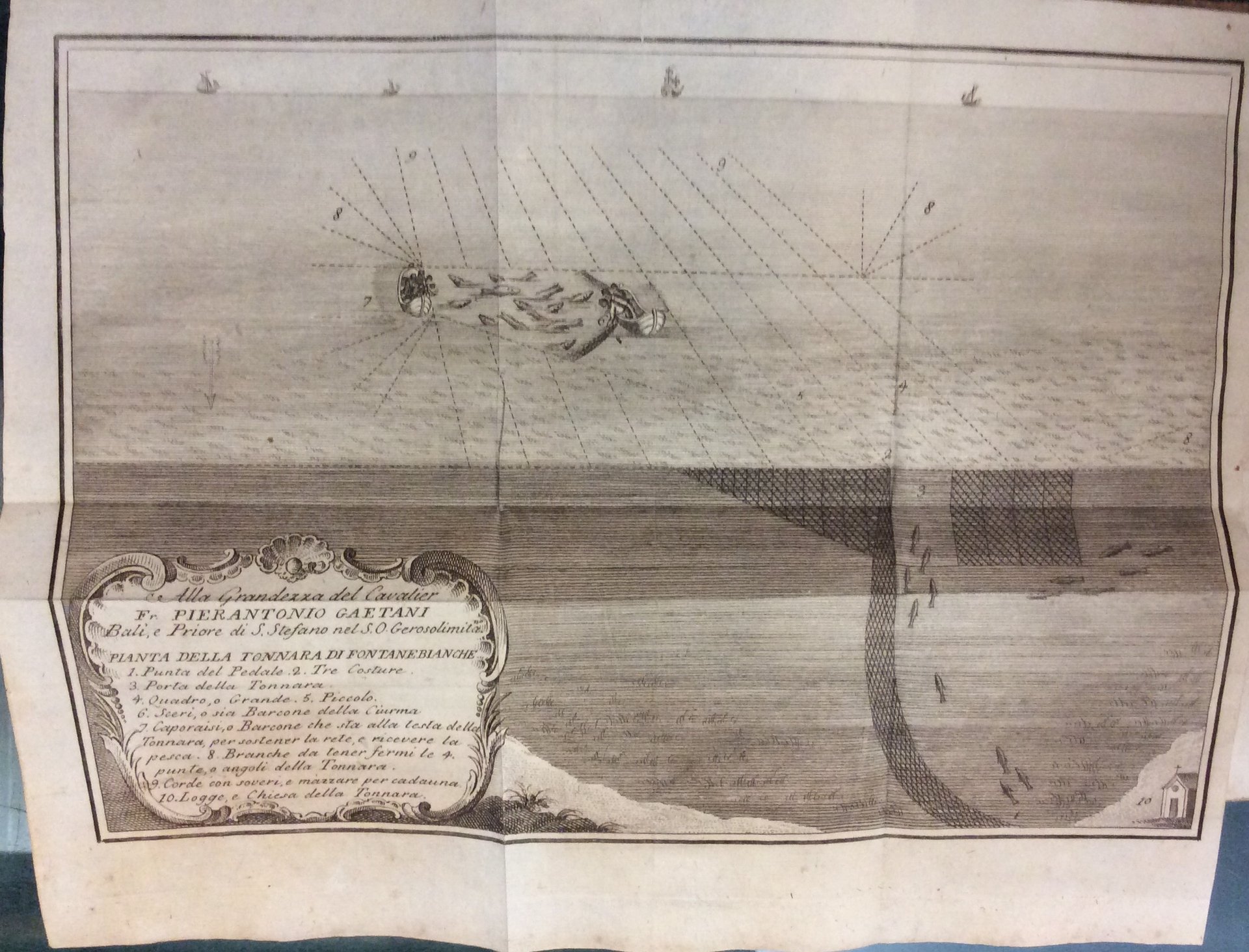 In-8 p. (mm. 200x130), cartonato rustico coevo (dorso rifatto; con aloni), pp. XVI,336, con 1 tavola incisa in rame, ripiegata fuori testo, che raffigura la Pianta della tonnara di Fontanebianche, con le barche ed i pesci nella camera della morte. "Rara prima edizione" dell'opera del Conte della Torre, Cesare Gaetani, de' Marchesi di Sortino, Diputato ai Regj Studj, Custode del Fonte d'Aretusa, e suoi Agricoltori, Pastori, e Pescatori Aretusini. Cfr. Ceresoli, p. 260: Opera molto rara ignota alle bibliografie specializzate.. che può considerarsi un classico della letteratura pescatoria italiana" - Mira I, 376.Venticinque idilli di vario metro ciascuno accompagnato da note e dedicato ai personaggi più diversi. In fine idilli in onore di Maria Vergine, di Santa Lucia, poi una cantata scritta nella Tonnara di Fontanebianche.. In fondo uno scritto di Giuseppe Logoteta Sopra l'uso, e l'astinenza de' pesci presso gli antichi', e poi, assai curiosamente un Manifesto' assai elogiativo di presentazione di un libro di prossima edizione, dell'Avvocato Francesco di Paola Avolio: Riflessioni sovra le leggi sicole intorno alla pesca'..Questo Cesare Gaetani era evidentemente un patito della pesca e non resiste a tradurre dal greco i due sonetti del siracusano Mosco e l'ode di Anacreonte riguardanti argomenti pescatori (così Moncada Lo Giudice, 892). Esemplare donato dall'A. (come da scritta autografa al frontespizio); timbro di biblioteca privata, alcune lievi fioriture e aloni marginali, ma complessivamente bell'esemplare, con barbe..