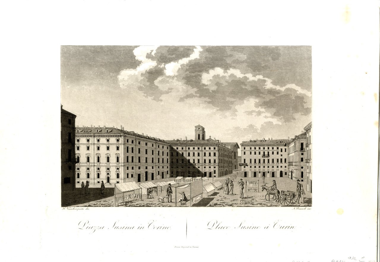 Il titolo della tavola è "Piazza Susina in Torino | Place Susine à Turin". Incisione firmata, di A. Biasioli su disegno di H. Vancleenputte. Sotto, in centro, "Pressso Reycend in Torino". Veduta prospettica della Piazza Susina (ora Savoia) con il caratteristico mercato degli stracci vecchi e della ferramenta. Questa piazza appartiene al terzo ingrandimento della città. Era chiamata Susina dalla porta omonima ed anche Paesana dal palazzo dei marchesi Saluzzo-Paesana, che vi si trova. Dal 1860 si chiama Savoia"" (Peyrot, I, 7, p. 409).