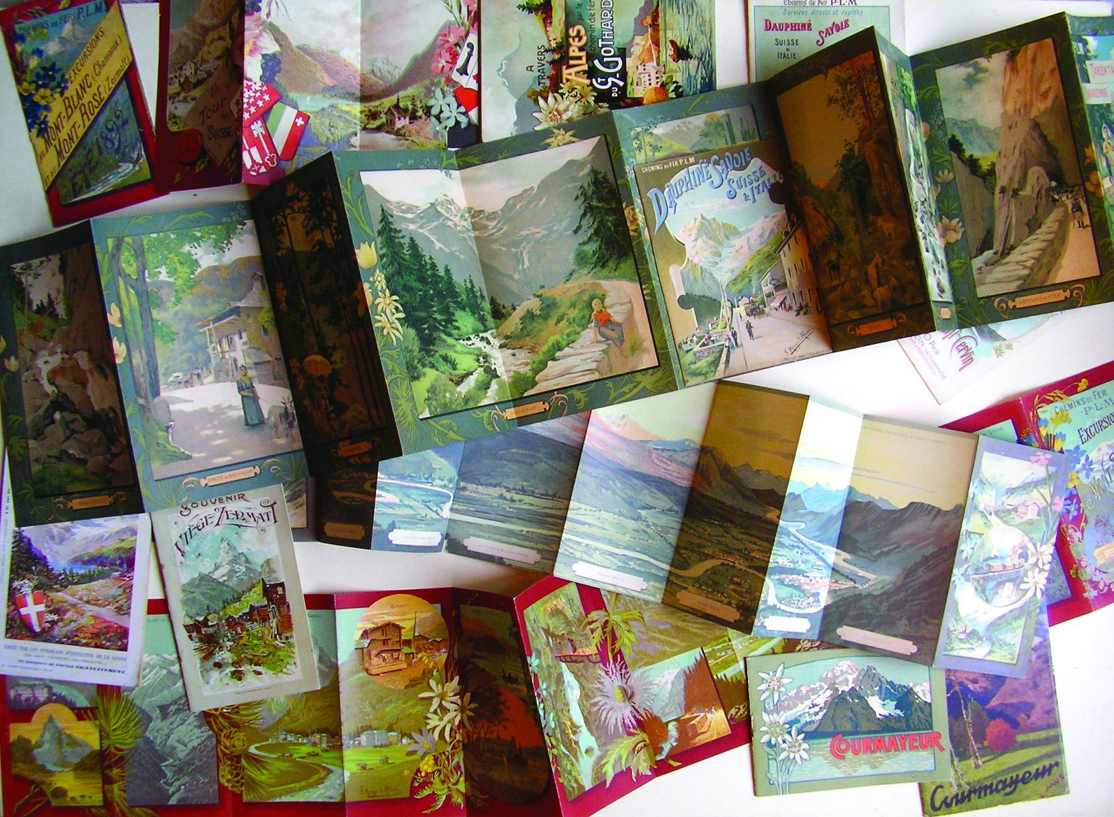 >Sette plachette in-16, deliziosamente illustrate, con copertine in cartoncino figurato a colori, varie illustrazioni, vedute e cartine topografiche di itinerari, paesi e monti delle Alpi. 1) Dauphiné-Savoie, Suisse & Italie. 2)La Savoie pittoresque. 3) Excursions au Mont-Blanc et au Mont-Rose. 4) Courmayeur (copertina di Italo Mus). 5) Courmayeur, guide pour le touriste. 6) Dauphiné-Savoie-Suisse-Italie. 7) A' travers les Alpes du St.Gothard par le chemin de fer. - Ottima conservazione.