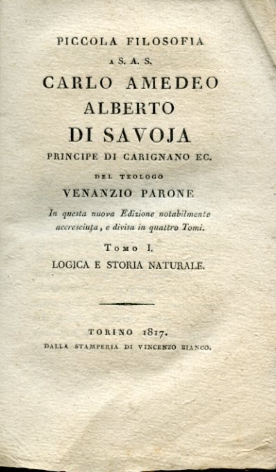 4 voll. in-16°, pp. VIII, 262; (2), 224; 252; 276; brossura editoriale. Reintegrazioni alla porzione superiore del piatto del secondo vol., per il resto ottimo esemplare in barbe e a fogli chiusi. Rara ristampa, riveduta e ampliata, di corso di filosofia concepito dal sacerdote e teologo Parone per l'istruzione di Carlo Alberto giovinetto. Il primo vol. è di logica e storia naturale, il secondo di ontologia e teologia naturale, il terzo tratta 'dell'uomo fisico e morale', il quarto di 'morale naturale'.