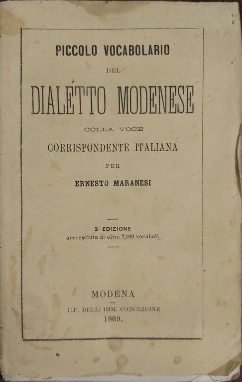 PICCOLO VOCABOLARIO del dialetto modenese colla voce corrispondente italiana per … 2. Edizione accresciuta di oltre 2000 vocaboli.