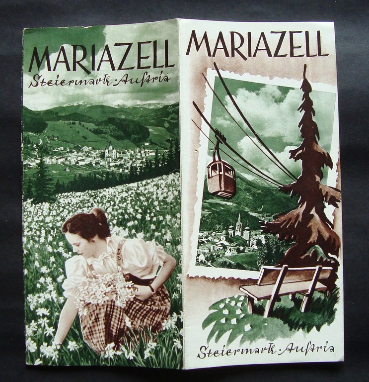 Pieghevole Turistico, MARIAZELL STEIERMARK-AUSTRIA Elbomuhi Wien III,s.d. anni '50, cm 21 x 10, (chiuso), molte ill fotografiche virate in verde Condizioni di conservazione. buono stato con leggere tracce d'uso e del tempo. OPEB.2808 BLU