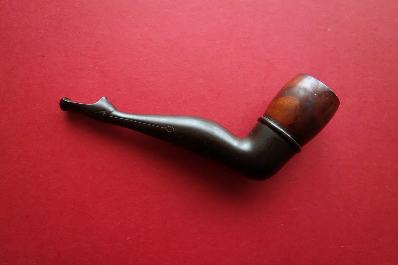 Pipa d'epoca in radica, Bella pipa d'epoca in radica cannello con fattezze di gamba femminile bocchino a forma di scarpetta Made in France, XIX° secolo; bella pipa d'epoca in radica, unica e raffinata per qualità esecutoria. Originale. Dimensioni: cm circa 11 (lunghezza del cannello e bocchino) x5,5 (altezza dal termine del cannello al vertice del fornello). Condizioni di conservazione Buone condizioni con normali tracce d'uso e leggeri segni del tempo; cannello con qualche minimo leggerissimo graffietto. Per ulteriori dettagli vedi foto. Oggetto unico, molto bello e particolare. Fabbricazione francese. SC04.D0538 N