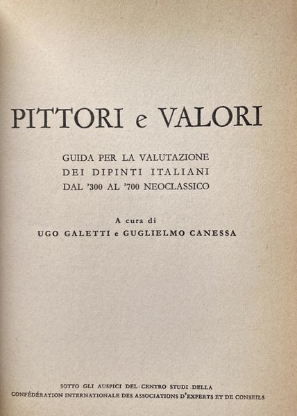 PITTORI E VALORI. GUIDA PER LA VALUTAZIONE DEI DIPINTI ITALIANI DAL '300 AL '700 NEOCLASSICO. A CURA DI UGO GALETTI, GUGLIELMO CANESSA