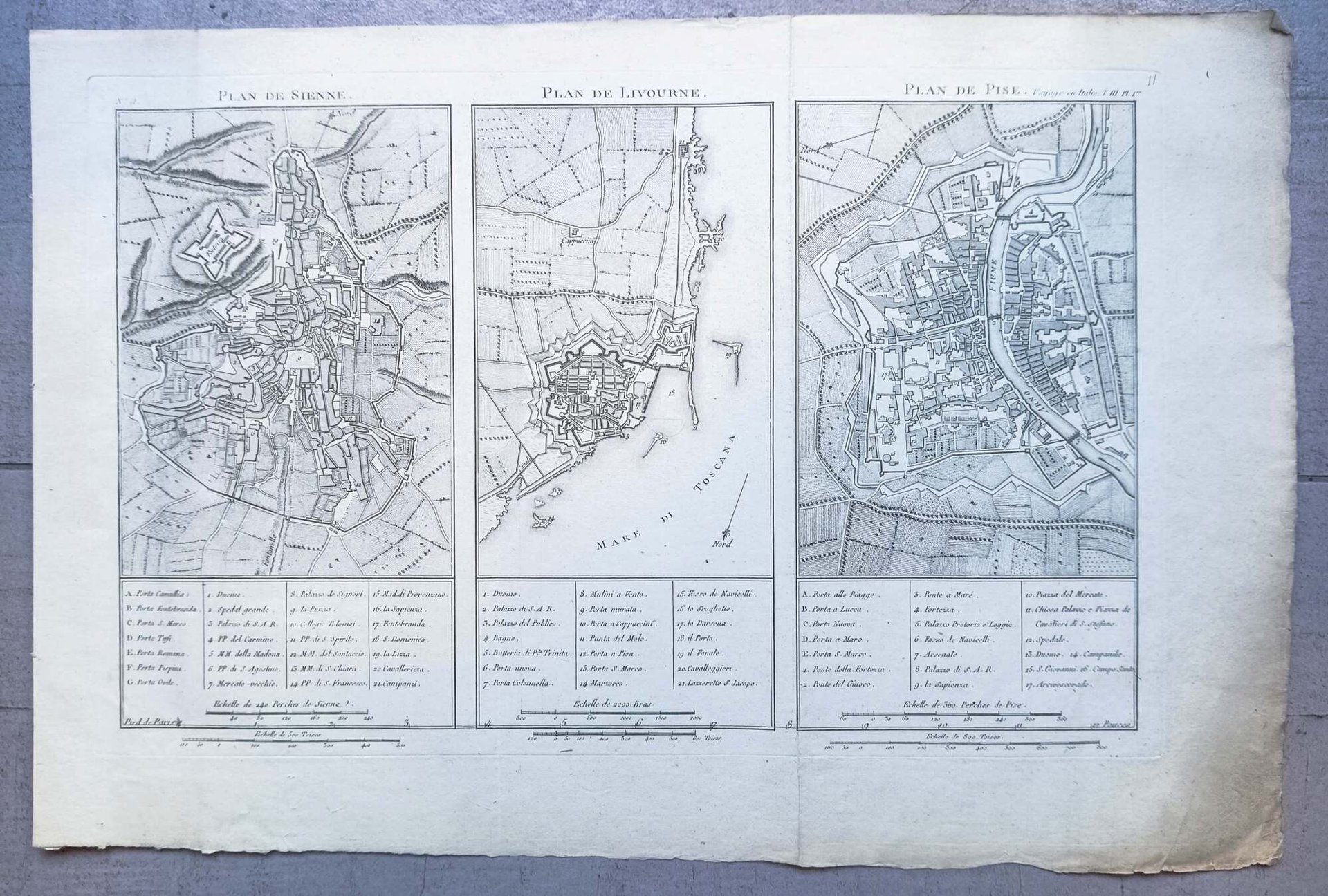 >Incisione originale in rame (mm240 x 375), rappresentante le piante delle città di Siena, Livorno e Pisa, tratta dall'opera "Voyage en Italie, contenant l'Histoire & les Anedoctes les plus singulieres de l'Italie, & sa description; les Usages, le Governement, le Commerce, la Literature, les Arts, l'Histoire naturelle & les Antiquités; avec des jujements sur les ouvrages de peinture, Sculpture & architecture, & les Plans de toutes les grandes villes d'Italie" di J. De la Lande. L'incisione fa parte della seconda edizione dell'opera creata dall'astronomo francese , che ampliò la precedente da 8 a 9 volumi. Le tre piante sono corredate do legenda. In alto a sinistra, entro la battuta, indicazione della tavola "N. 11" ; a destra, "Voyage en Italie. T. III. Pl. 1.re". Esemplare ben conservato, segni di pieghe perché inserita nell'atlante.