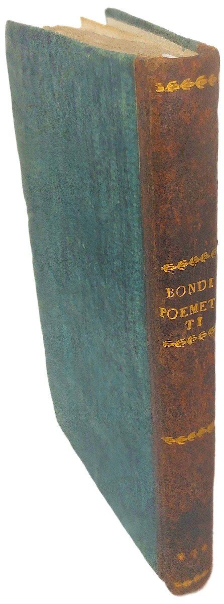 >2 opere in un vol. in-8, pp. 160, (8), XV, 96, leg. coeva m. pelle. Due graziose vignette incise in rame ai due frontespizi, impresa tipografica in fine della prima opera, numerosi fregi silografici. Pregiata edizione collettiva delle Rime del Bondi. La prima parte comprende i poemetti, la seconda ''Le Conversazioni'' ed altre composizioni minori. Ottimo esemplare a pieni margini. Morazzoni p. 218.