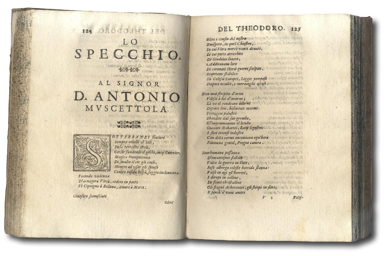 >in-4, pp. (30), 444, (6), leg. coeva in p. pergamena, titolo ms. al dorso. Bell'antiporta allegorico inc. in rame: la Fama alata, con armi dei Farnese, annuncia al Tempo l'opera di Teodoro; raffinate testatine, finalini e iniziali istoriate in silografia decorano il testo. Precedono la dedica di Teodoro a Ranuccio II Farnese (duca di Parma e Piacenza dal 1646 al 1694), la dedica del figlio dell'autore "A' lettori" e una serie di versi encomiastici in latino. Prima edizione di questa raccolta di versi in italiano (riedita nel 1668 e 1679) dedicati ad alcuni dei più celebri signori del tempo, soprattutto del Regno di Napoli (Ercole Trivulzio, il Duca di Sora, il Principe di Cassano della Casa d'Aragona, il cardinale Giovanni Carlo de'Medici...). I componimenti, vari ed articolati, toccano temi disparati: dalle odi al Tempo, al Silenzio, all'Ingegno, ai versi sull'archibugio, sull'arte nautica e sulla scherma, in cui una coppia di cavalieri viene invitata ad affidarsi "Al valor più, ch'allarmi" e vengono descritte le fasi del combattimento. La scherma, descritta allegoricamente, viene presentata sotto l'aspetto giocoso con dotti riferimenti a celebri libri sull'argomento come quello del Marcelli. L'autore, conte di Toraldo (famiglia di origini quattrocentesche legata alla dominazione spagnola del Regno di Napoli) fu un poeta noto e apprezzato in numerose corti del sud Italia. Buon esemplare di questa rara raccolta poetica (angolo superiore dei primi ff. anticamente rimarginato, timbro di collezione privata all'occhietto). Manca a tutti i repertori bibliogr. consultati.