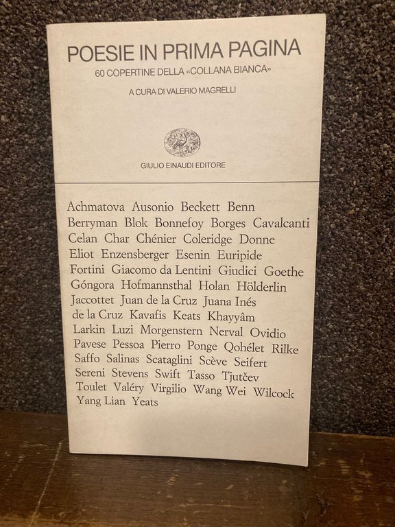 In-16° (18x11 cm), pp (80), brossura editoriale con titoli e paratesti ai piatti. Edizione fuori commercio. Ottimo esemplare. Omaggio meta-editoriale alla Collana Bianca ovvero alla Collezione di Poesia in occasione del 261° volume edito a più di vent'anni dal primo (1964) consistente nella riproduzione di sessanta copertine tra le più significative nell'identificarne la prospettiva mondiale e diacronica, come già per I Millenni. Come ricordato nella nota introduttiva la collana fu progettata graficamente da Bruno Munari con l'intervento fattivo dell'editore che aggiunse il semplice tratto che divide sul piatto anteriore il titolo dalla lirica esemplare della raccolta a rispecchiare l'equilibrio e la nettezza formale del progetto editoriale.