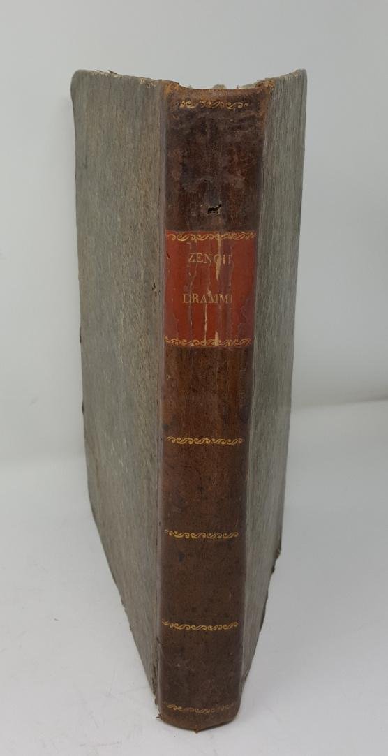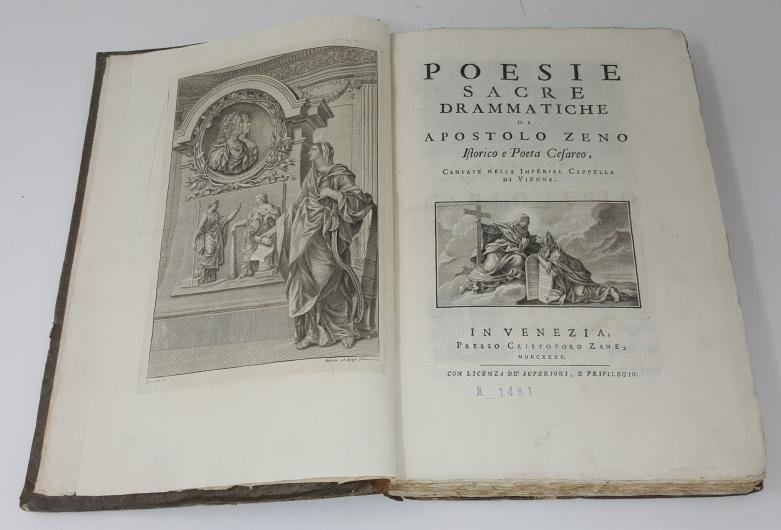 >in-4(mm 295x200), (20), 506, (2); leg. coeva mezza pelle. Antiporta allegorico finemente inciso in rame da A.J. Schmuzer; vignetta al frontespizio, testata con le armi di Carlo VI, dedicatario dell'opera, una grande iniziale istoriata. Prima edizione della raccolta dei maggiori drammi sacri dell'erudito veneziano considerato il creatore dell'''Oratorio'' moderno, cui diede unità d'azione, di tempo e di luogo. Costituita da 16 brevi azioni d'argomento biblico, di cui 13 tratte dal Vecchio Testamento, la presente raccolta è considerata la parte più felice e persuasiva della vasta produzione teatrale dello Zeno. Apostolo Zeno (Venezia, 11 dicembre 1668; Venezia, 11 novembre 1750) è stato un poeta, librettista, giornalista e letterato italiano. Nobile veneziano, fu nel 1691 tra i fondatori dell'Accademia degli Animosi. Nel 1710 insieme al fratello Pier Caterino Zeno, Scipione Maffei e Antonio Vallisneri fondò il Giornale de' letterati d'Italia. Bell'esemplare a pieni margini, fresco ed in barbe (Firma di possesso sull'occhietto, ex libris Giorgio Fanan). Morazzoni p. 263. Gamba 2522: ''Magnifica edizione''.