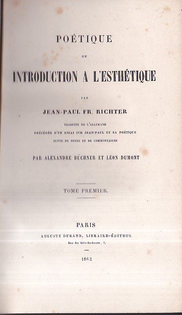Poétique ou introduction a l' esthétique. Traduite de l' allemand précédée d' un essai sur Jean Paul et sa poétique suivie de notes et de commentaires par Alexandre Büchner et Léon Dumont