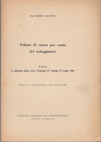 Polizze Di Carico Per Conto Del Noleggiatore Nota A Sentenza Della Corte D'appello Di Venezia 27 Luglio 1946 | Libros antiguos y modernos | Casanova Mario