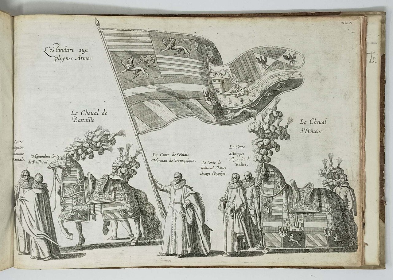 >in-folio oblungo, leg. antica cart., dorso in pelle. Stupendo frontespizio figurato inciso, con varie figure allegoriche funebri, ritratto e armi della Casa d'Austria, 12 ff. a stampa, 46 grandiose tavole (due più volte ripieg.) raffiguranti gli apparati ed il sontuoso corteo funebre svoltosi in Sainte-Gudule di Bruxelles il 20 marzo 1622, tutte finemente incise all'acquaforte da Cornelius Galle. Esemplare completo ed in buona comnservazione (le due grandi tav. rinforzate al verso; qualche traccia di piega; qualche margine frastagliato). Su foglio di guardia antiche note manoscritte. Prima edizione. VINET 622: “Volume rare, curieux, intéressant surtout parce qu’il fait connäitre les coustumes du temps...”. LIPPERHEIDE 2660. RUGGERI 1070.