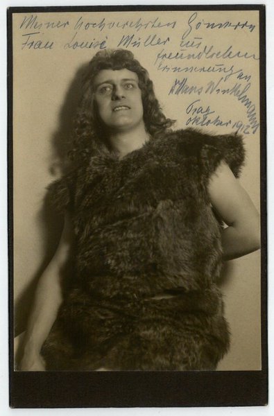 168:108 mm. Kniestück des Schauspielers im Rollenkostüm mit Widmung auf der Bildseite: "Meiner hochverehrten Freundin Frau Louise Müller zur freundlichen Erinnerung […]". - Winkelmann begann seine Bühnenlaufbahn nach seinem Gesangsstudium 1906 an der Wiener Volksoper, war dann jeweils eine Spielzeit am Stadttheater in Graz und an der Hofoper in München engagiert und trat seit 1909 am Deutschen Theater in Prag auf.