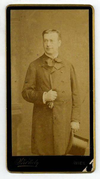40:80 mm. Kniestück des Schauspielers aus dem Atelier des Photographen Székely, Wien, mit dessen gedr. Signet am unteren Rand des Trägerkartons. Sonnenthal wünscht der Schauspielerin Amalie "Mama" Haizinger (1800-84) "tausend Glück und Segen für 1884". Widmung und Signatur auf der Verso-Seite. - Der in Pest geborene Schauspieler wurde 24-jährig 1856 von Heinrich Laube an das Wiener Hofburgtheater engagiert, "spielt den Mortimer und fällt durch. Laube läßt sich indes nicht beirren, gibt ihm einen dreijährigen Kontrakt, und ehe der abläuft, ist er zum k. k. Hofschauspieler ernannt [.] er wird zum meistbeschäftigten Mitglied des Burgtheaters: 160 Vorstellungen pro Saison. Heimlich verlobt mit der reichen Pauline Pappenheim, heiratet er sie erst, als die Familie verarmt, er aber schon konsolidiert ist [.] 1881 verleiht ihm Kaiser Franz Joseph die Eiserne Krone I. Klasse, die damals noch mit dem erblichen Adel verbunden ist. Arthur Schnitzler meint Sonnenthal, wenn er im 'Grünen Kakadu sagen läßt: 'Einer, der uns vorspielen kann, was er will, ist doch mehr als wir alle'" (Haeusserman, Das Wiener Burgtheater, Wien u. a., Molden, 1975, S. 57). Vgl. Öst. Lex. II, 409 und Czeike V, 250f.