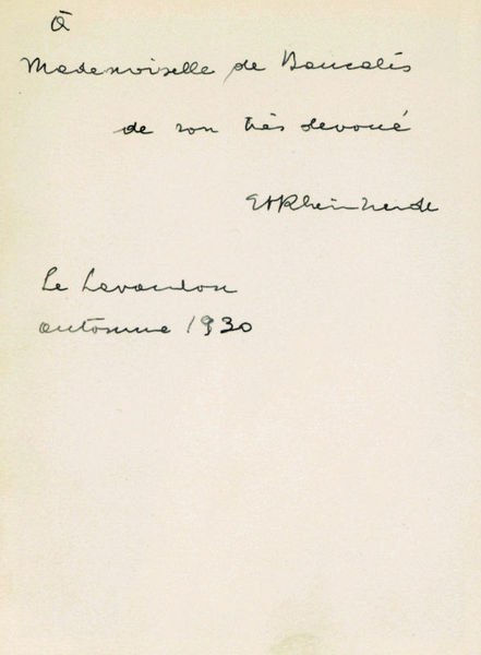 111:84 mm. Mit eigenhändiger Widmung auf der Rückseite: "à Mademoiselle de Baucalis de son très devoué EARheinhardt Le Lavandou automne 1930". - Emil Alphons Rheinhardt lebte seit 1928 in Le Lavandou, einer Ortschaft zwischen Nizza und Marseille; im April 1943 wurde er von der Gestapo verhaftet und am 25. Februar 1945 ist er im KZ Dachau gestorben. - Vgl. Martin Krist, "Wir sterben alle unseren eigenen Tod!" E. A. Rheinhardt (1889-1945), in: E. A. Rheinhardt, Tagebuch aus den Jahren 1943/44, Wien, 2003, SS. 147-166. Erich Hackl, Verlorene Welt tut weh, in: Die Presse/Spectrum, 10. Mai 2003, S. VIII. Koller/Withalm, Die Vertreibung des Geistigen aus Österreich, S. 54. Raabe, Autoren und Bücher, S. 391, Nr. 246.
