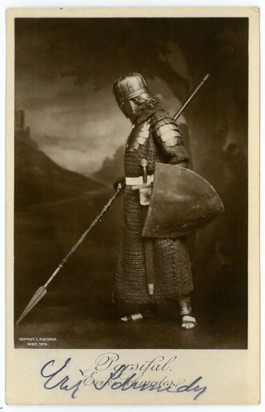 1 S. 8vo. Hübsche ganzfigürliche Darstellung des Sängers im Rollenkostüm zu Wagners ‘Parsifal’. - Schmedes debütierte 1891 als Bariton am Hoftheater in Wiesbaden in der Partie des Heerrufers im Lohengrin, sang dann am Stadttheater in Nürnberg und war nach Studien bei August Iffert in Dresden als Heldentenor an der Hofoper in Dresden tätig. 1898 kam er an die Wiener Hofoper und sollte ihr bis 1924 angehören. 1908 gab er in der Wiener Erstaufführung von d’Alberts "Tiefland" den Pedro, 1919 sang er die Titelrolle in Hans Pfitzners "Palestrina", wurde vor allem aber durch seine Wagner-Partien bekannt. Vgl. Öst. Lex. II, 352.