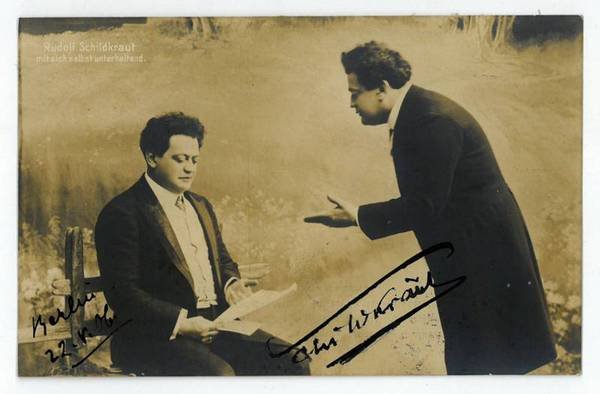 1 S. 8vo. Die Postkarte zeigt den Schauspieler "mit sich selbst unterhaltend". An einen Conrad Nachod in Prag adressiert, mit der Unterschrift auf der Bildseite. - Zuvor Mitglied einer Schauspieltruppe, wirkte Schildkraut seit 1893 am Wiener Raimundtheater, später am Carltheater, bis er 1900 an das Deutsche Schauspielhaus in Hamburg verpflichtet wurde. Max Reinhardt holte ihn 1905 an das Deutsche Theater in Berlin. Nach Gastspielen in New York 1911-13 wanderte Schildkraut mit seinem Sohn Joseph 1920 in die USA aus. Zunächst vorwiegend am jiddischen People's Theater tätig, trat er später auch in englischsprachigen Aufführungen auf und verstärkte seine Filmarbeit, die er bereits in Europa begonnen hatte.